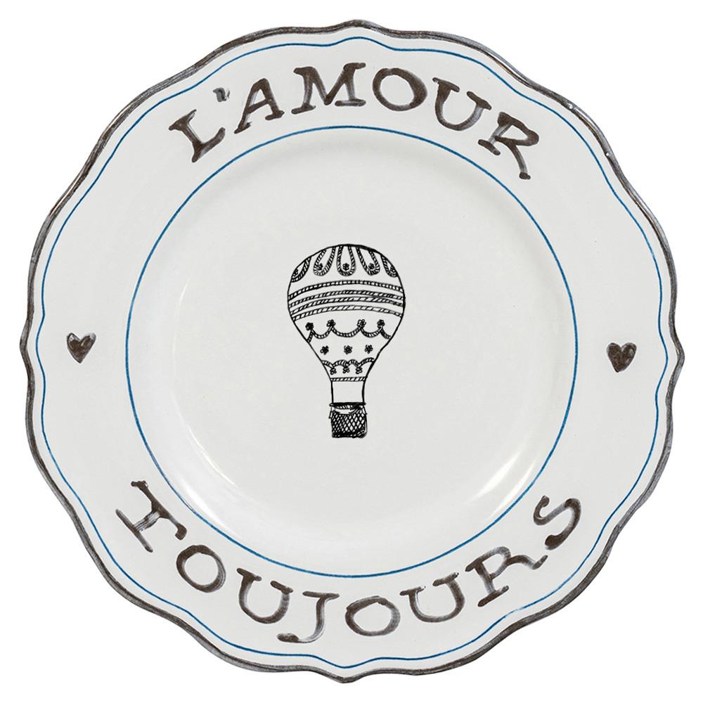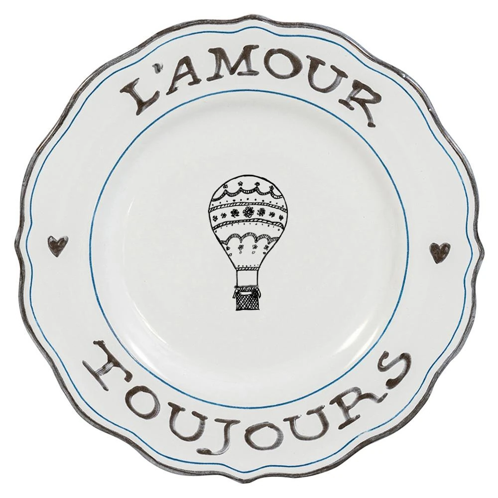 • Features a hand-sketched pair of hearts, a hot air balloon and a scalloped rim