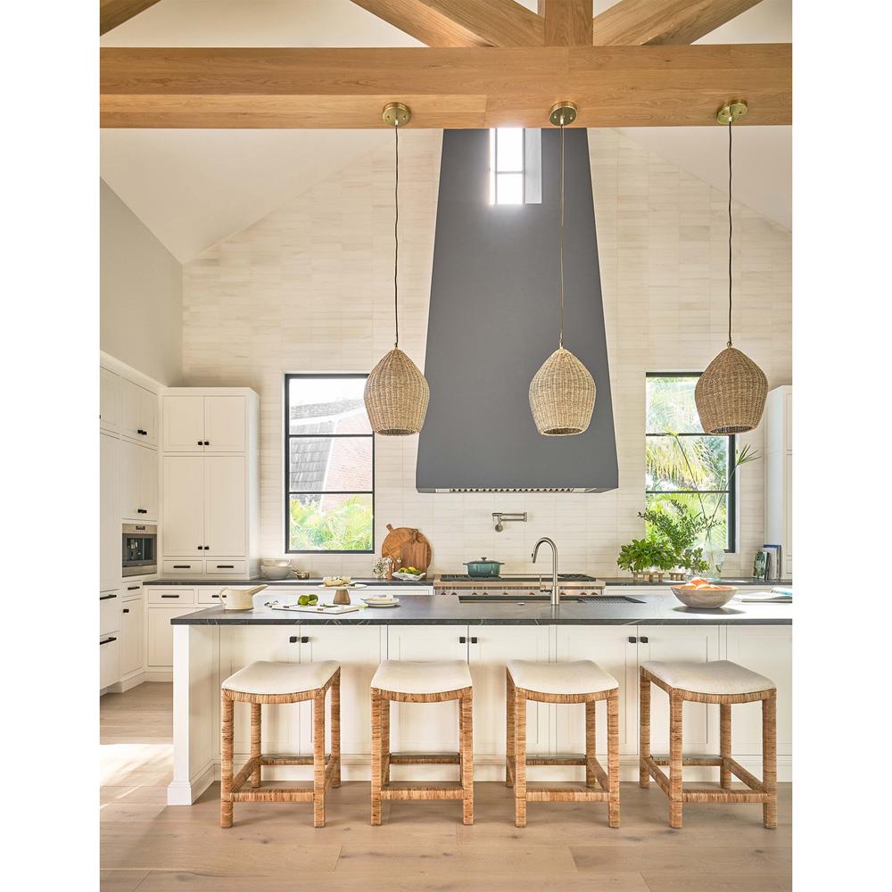• Vin Coastal White Upholstered Cushion Natural Woven Cane Black Wood Counter Stool|Kathy Kuo Home