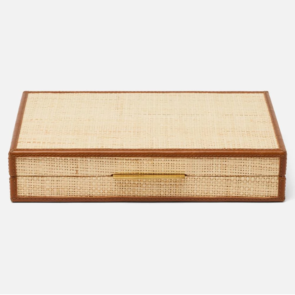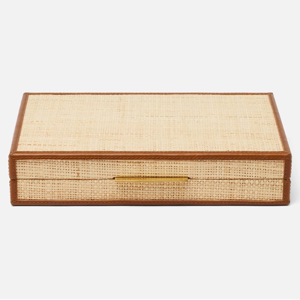 • Pigeon and Poodle Hanford Natural Woven Raffia Saddle Leather Trim Card Box|Kathy Kuo Home