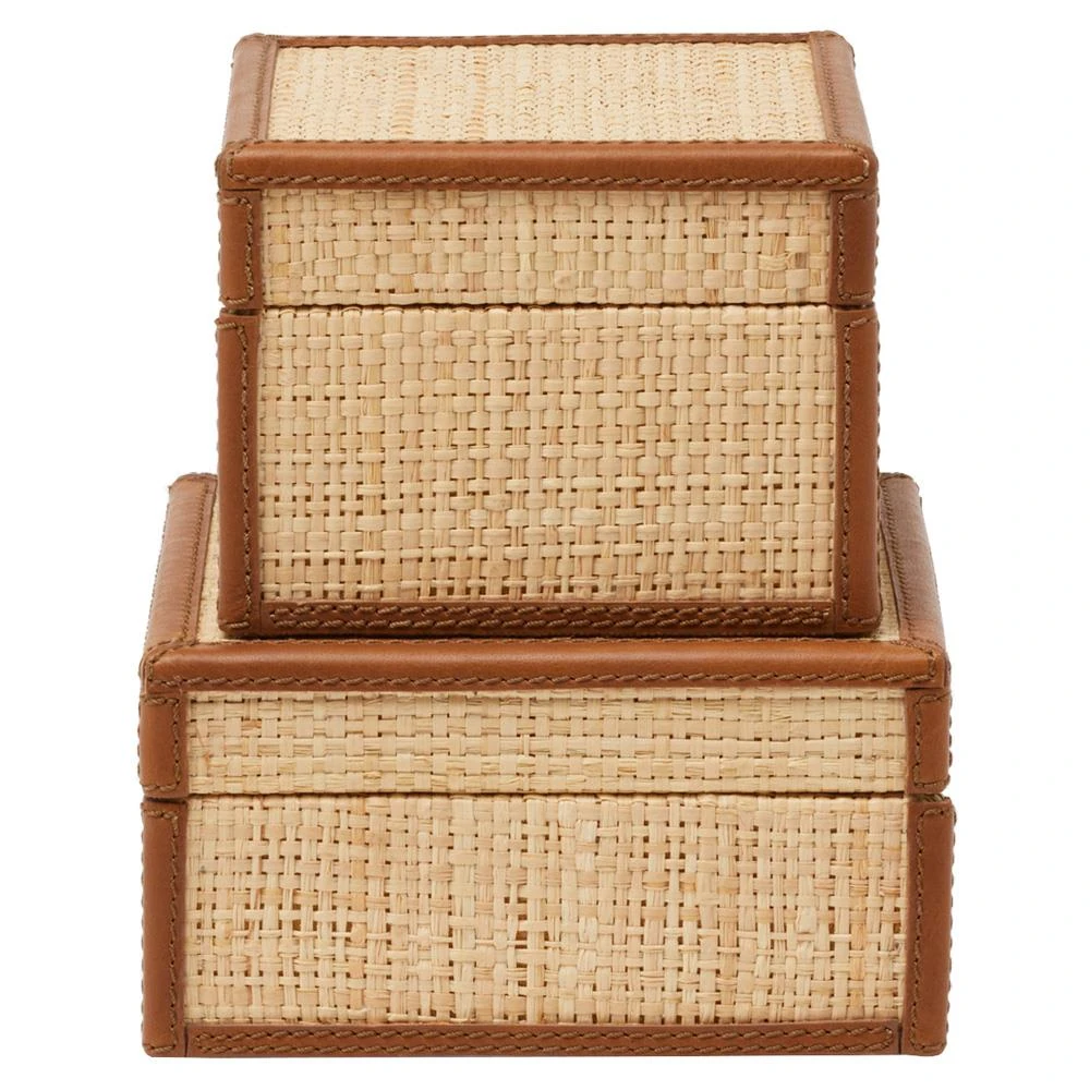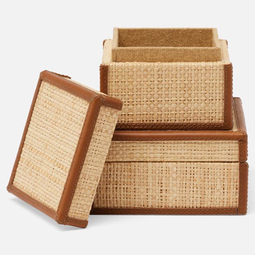 Pigeon and Poodle Hanford Natural Raffia Brown Leather Trim Decorative Box - Set of 2