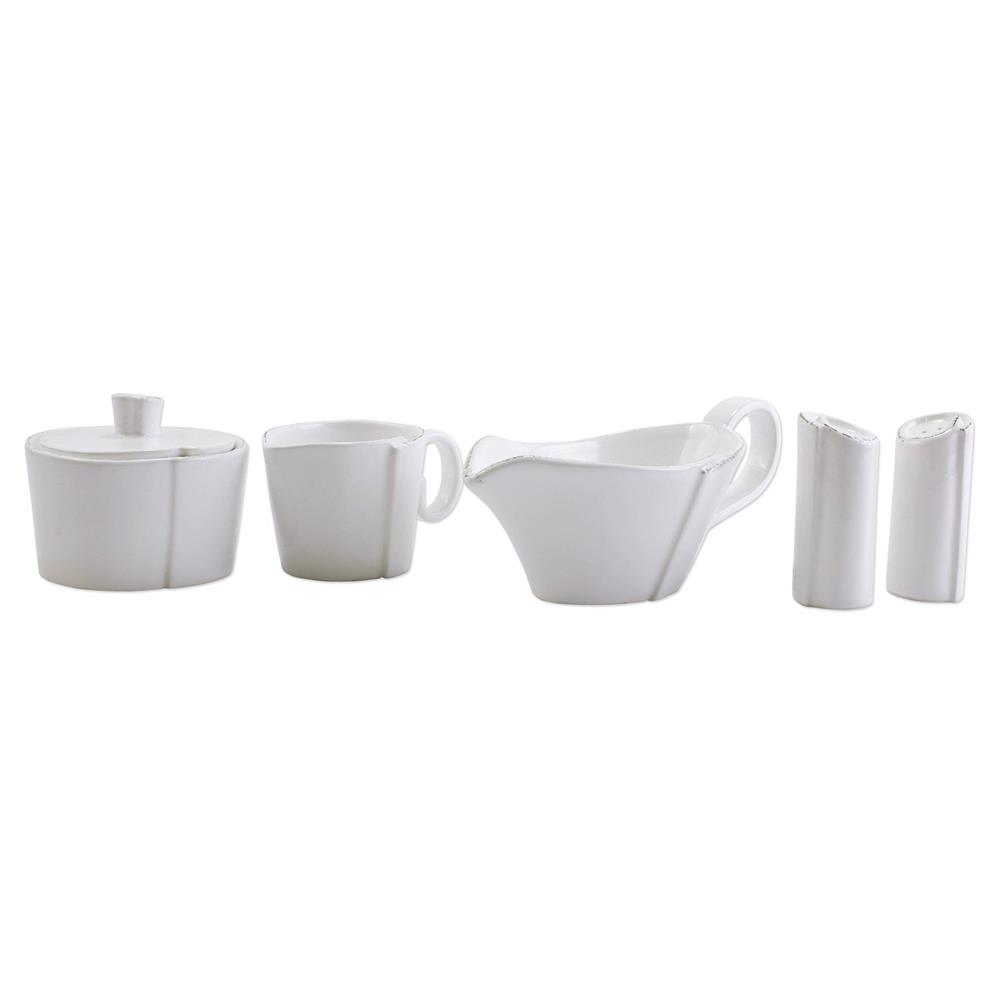 • Sugar: 4.25 inches high; Creamer: 3 inches high; Salt and Pepper: 4 inches high; Sauce Server: 3.5 inches high x 9.5 inches wide