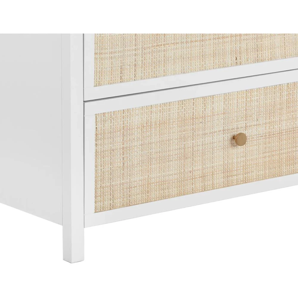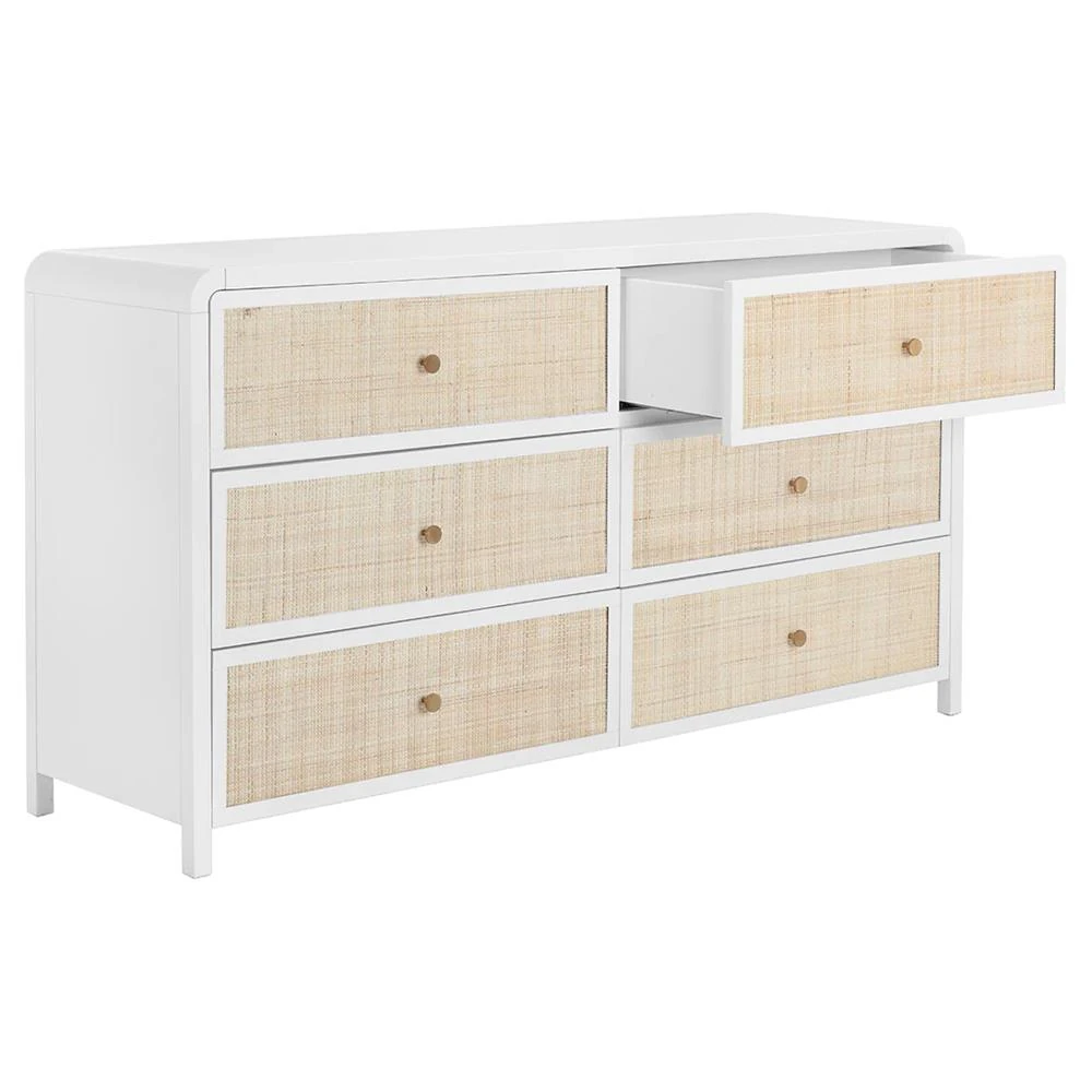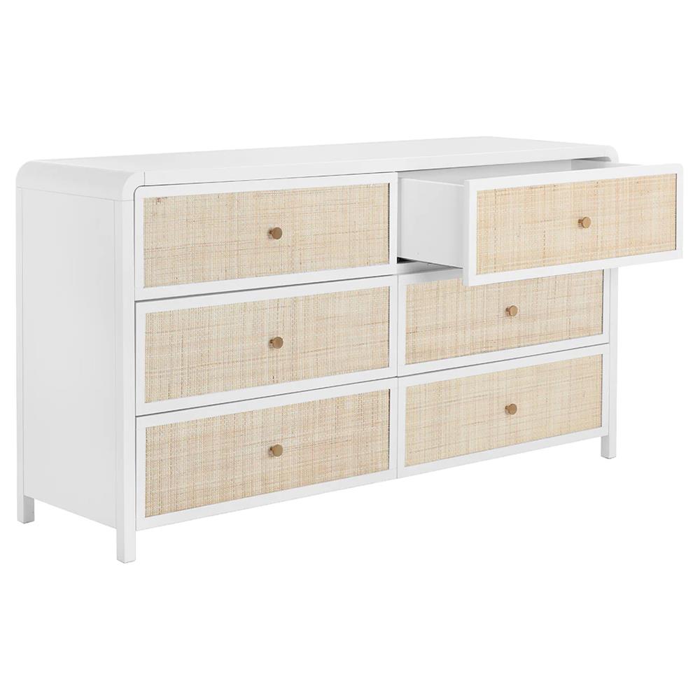 • Features an antique white wood frame with natural rattan detailing on 6 soft closing spacious drawers, completed with minted copper steel hardware