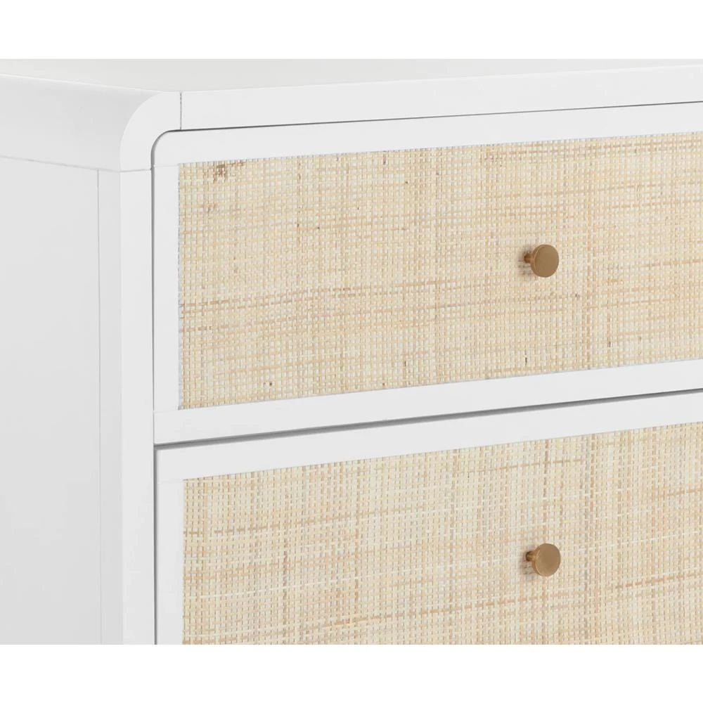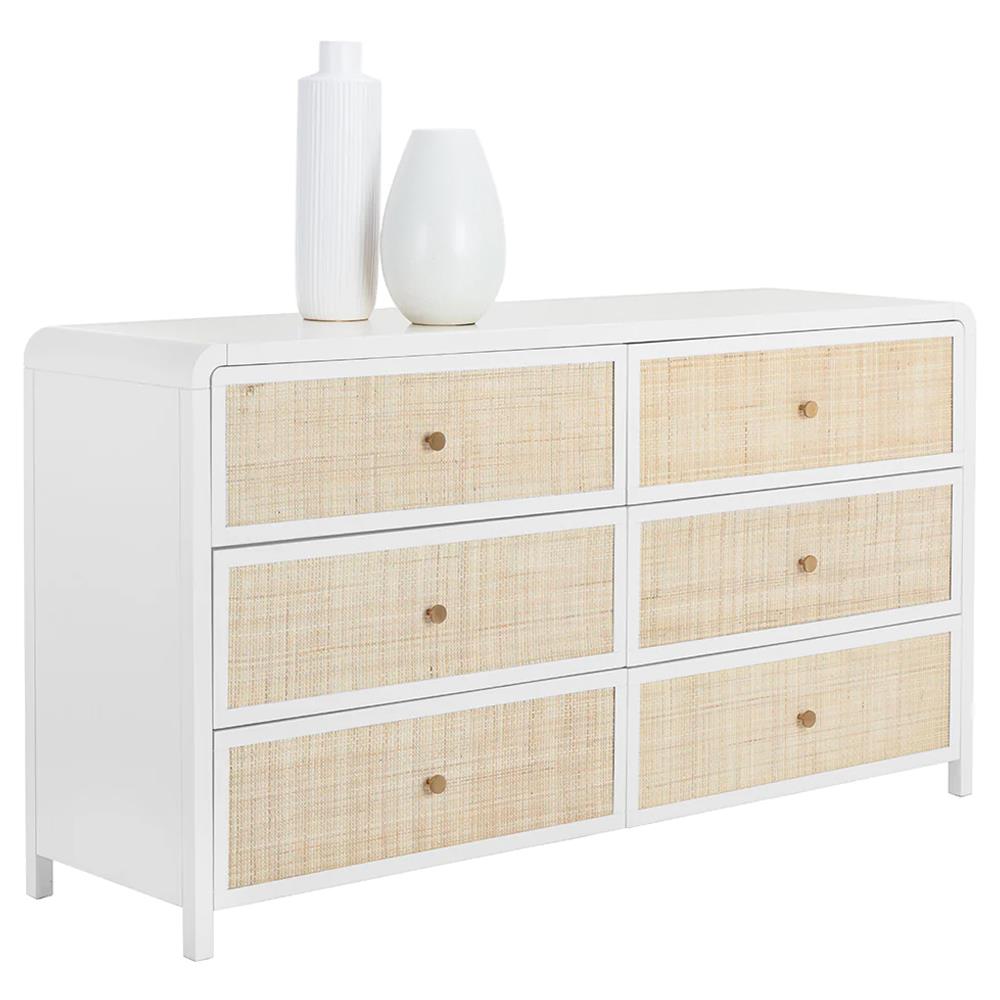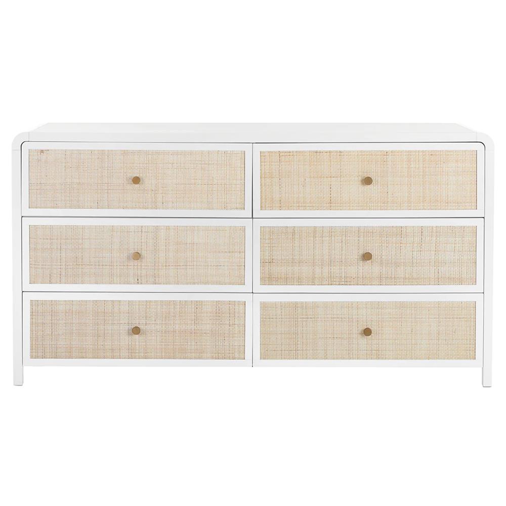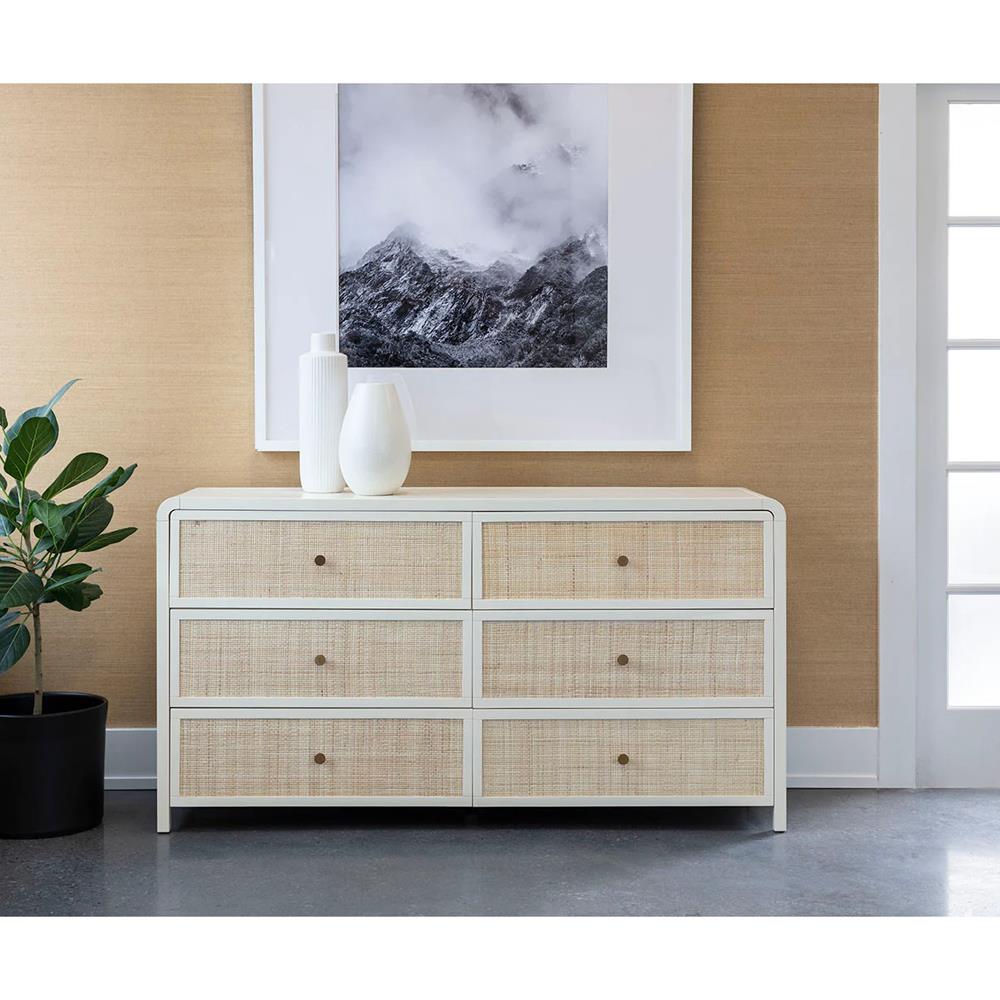 • Features an antique white wood frame with natural rattan detailing on 6 soft closing spacious drawers, completed with minted copper steel hardware
