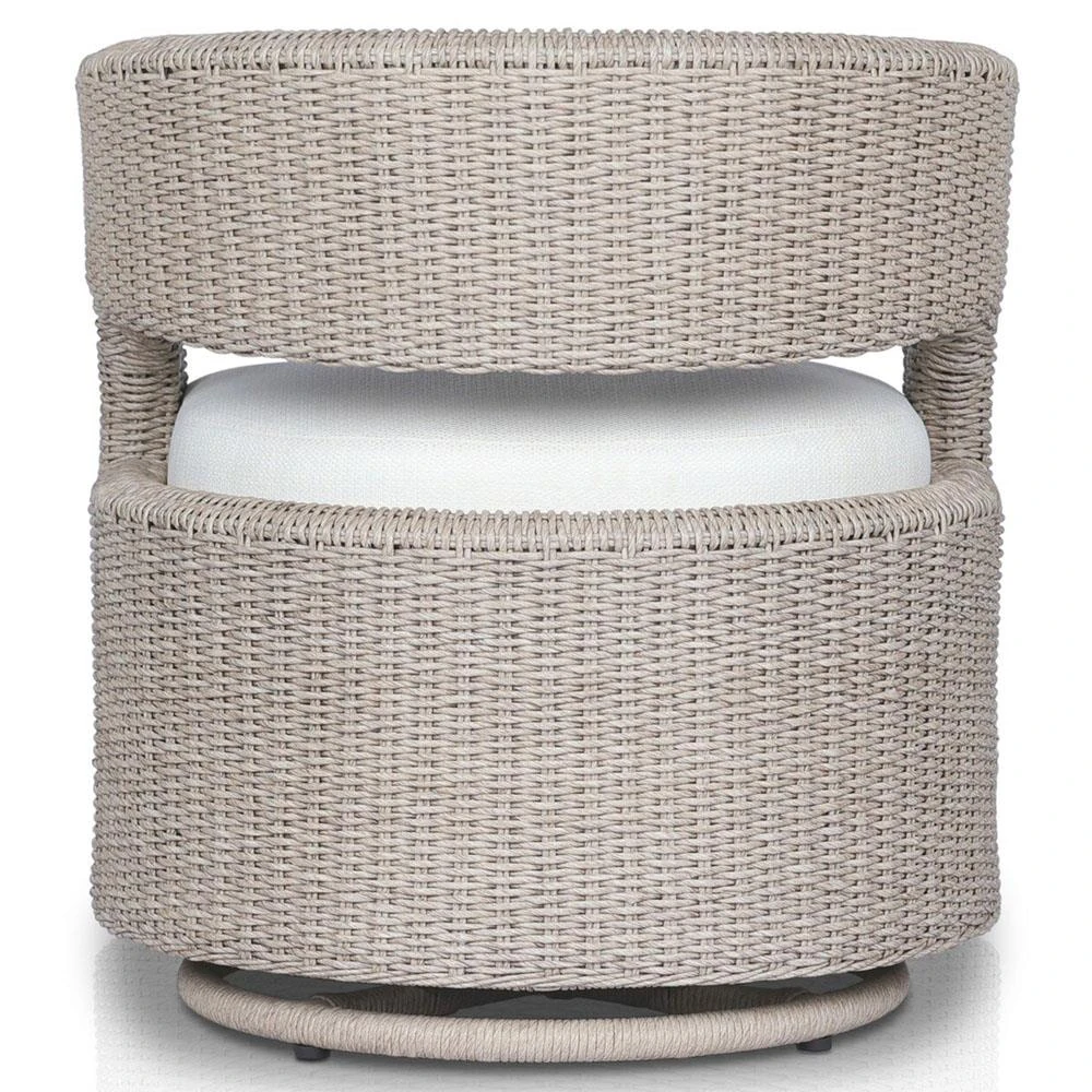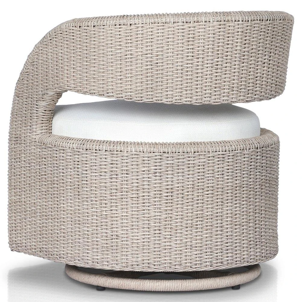 • This popular barrel-back shape with a cutout frame takes its place outdoors with a 360-degree swivel; Updated with a woven frame and a seat cushion in 100% olefin, known for its UV-resistant, water-repellent and quick-drying abilities