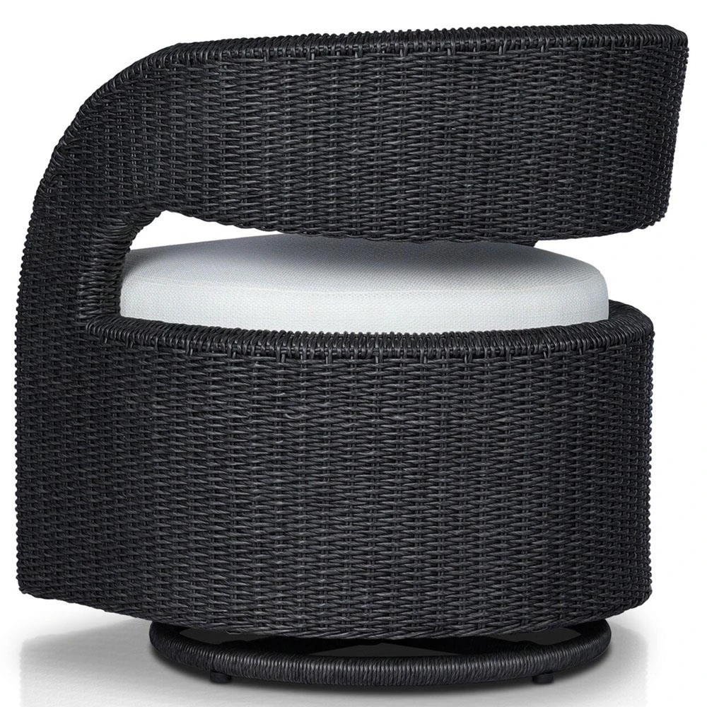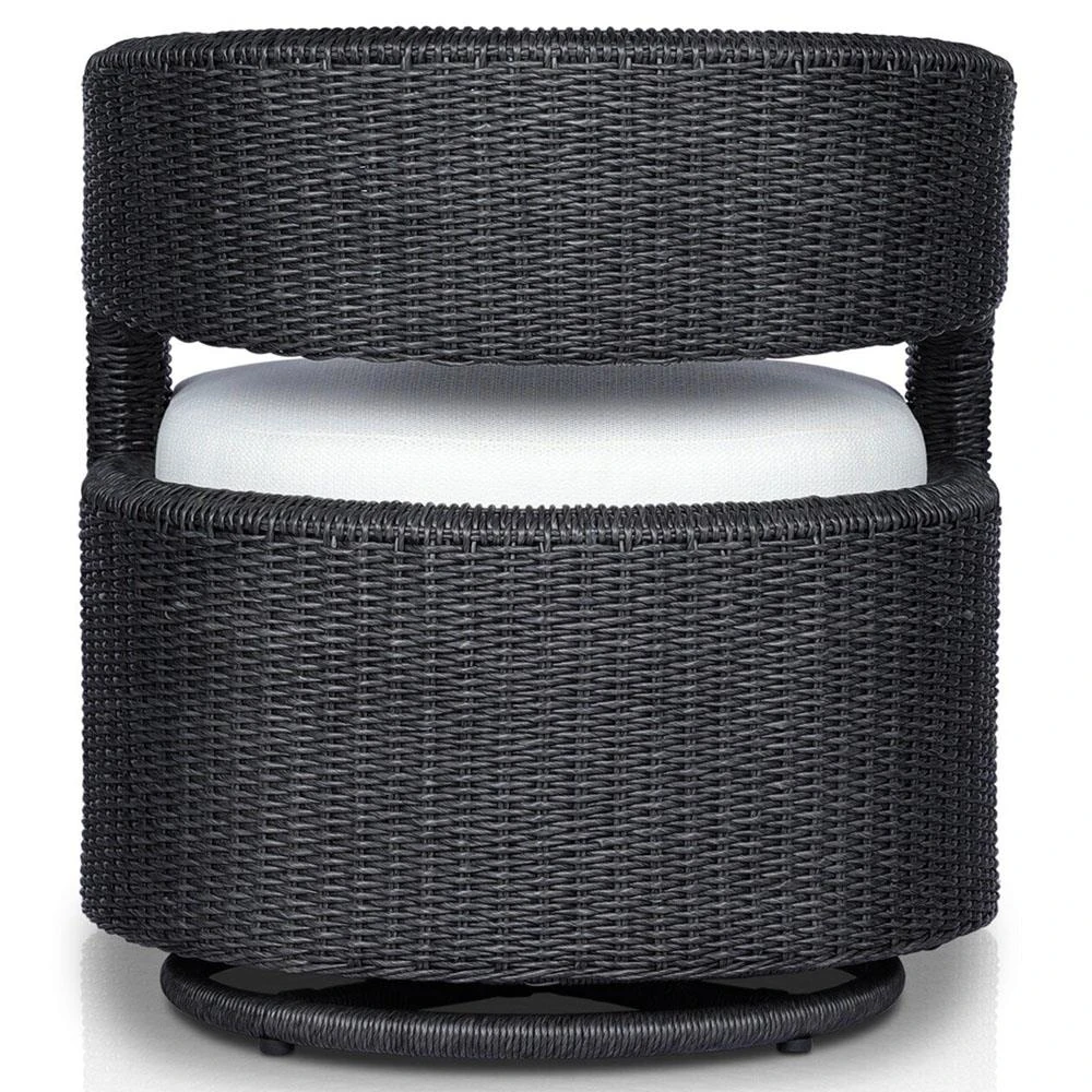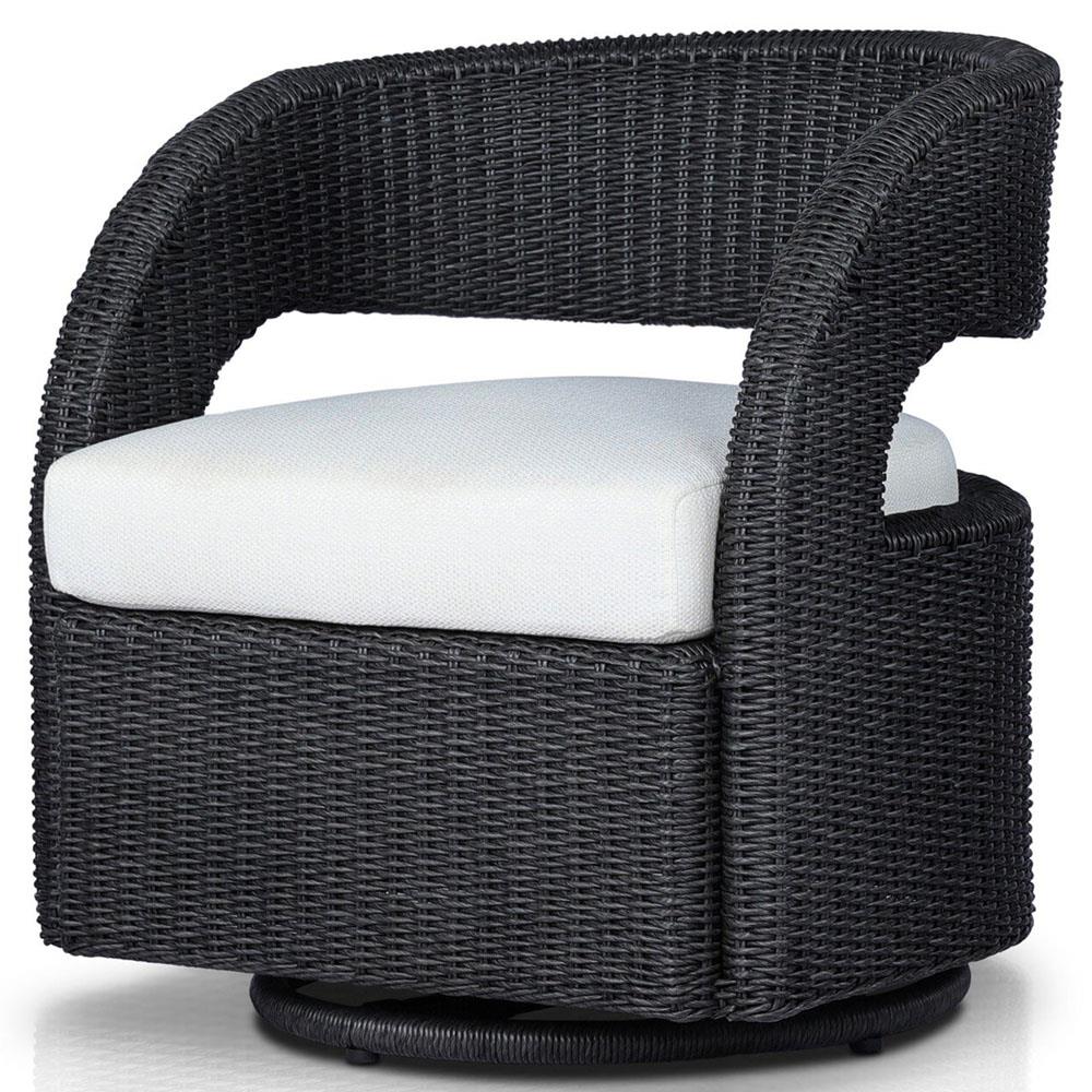 • This popular barrel-back shape with a cutout frame takes its place outdoors with a 360-degree swivel; Updated with a woven frame and a seat cushion in 100% olefin, known for its UV-resistant, water-repellent and quick-drying abilities