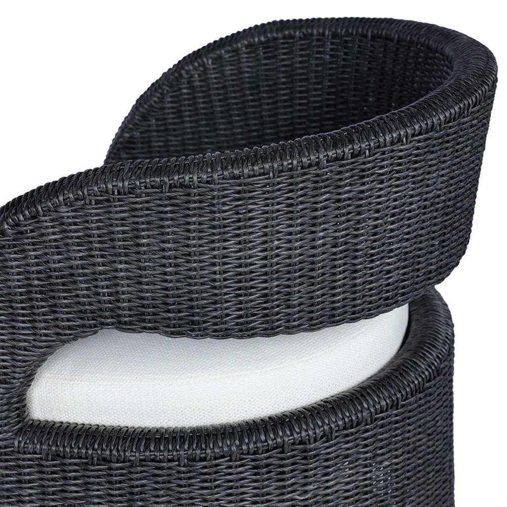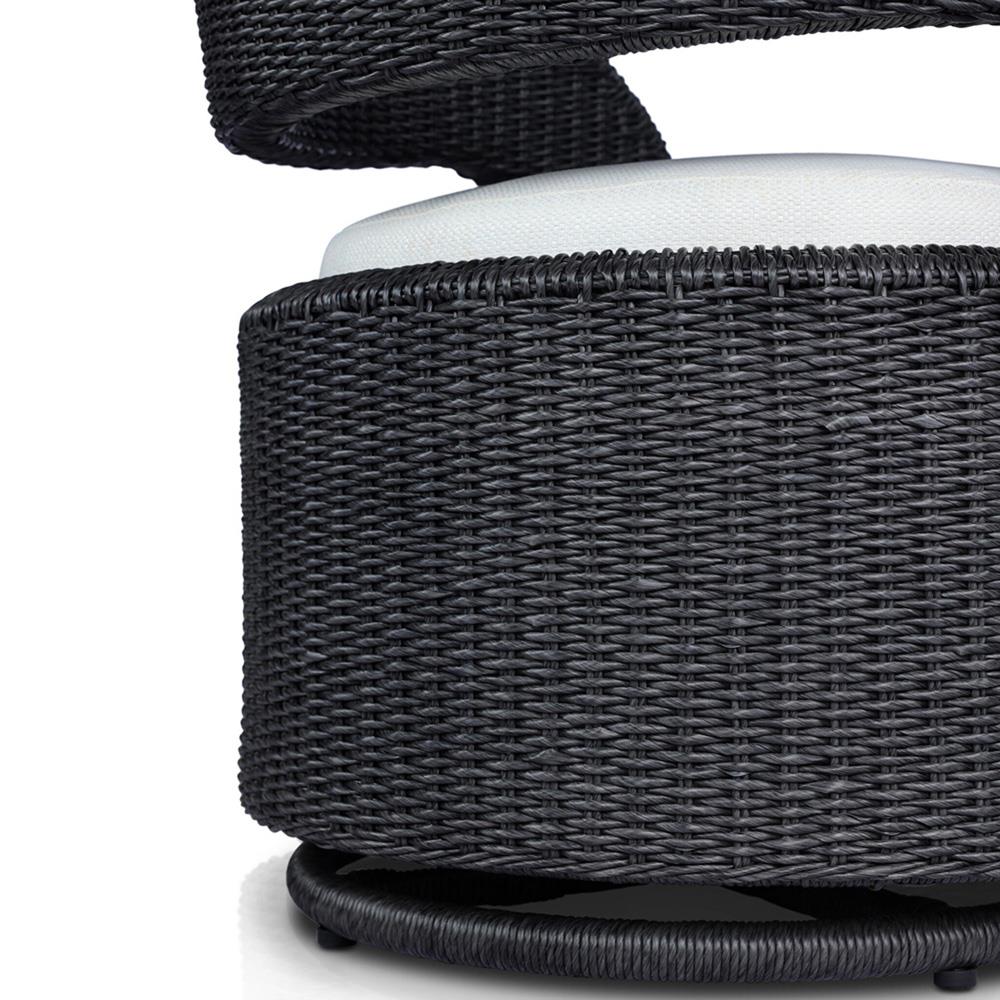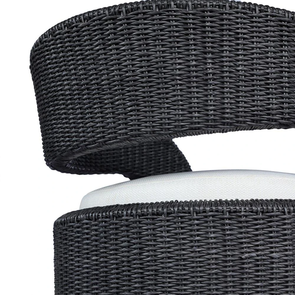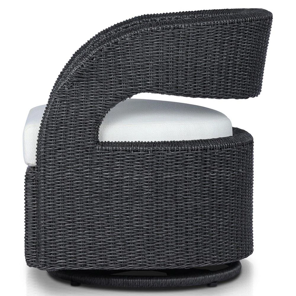 • This popular barrel-back shape with a cutout frame takes its place outdoors with a 360-degree swivel; Updated with a woven frame and a seat cushion in 100% olefin, known for its UV-resistant, water-repellent and quick-drying abilities