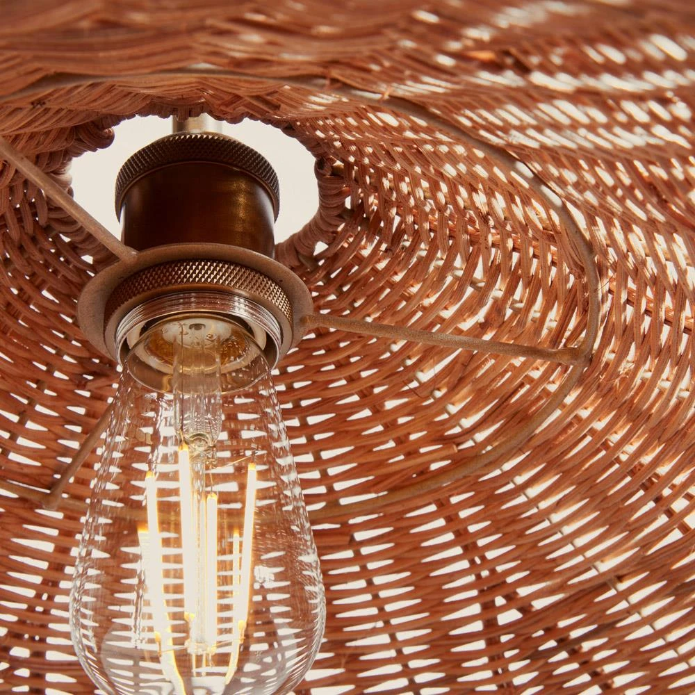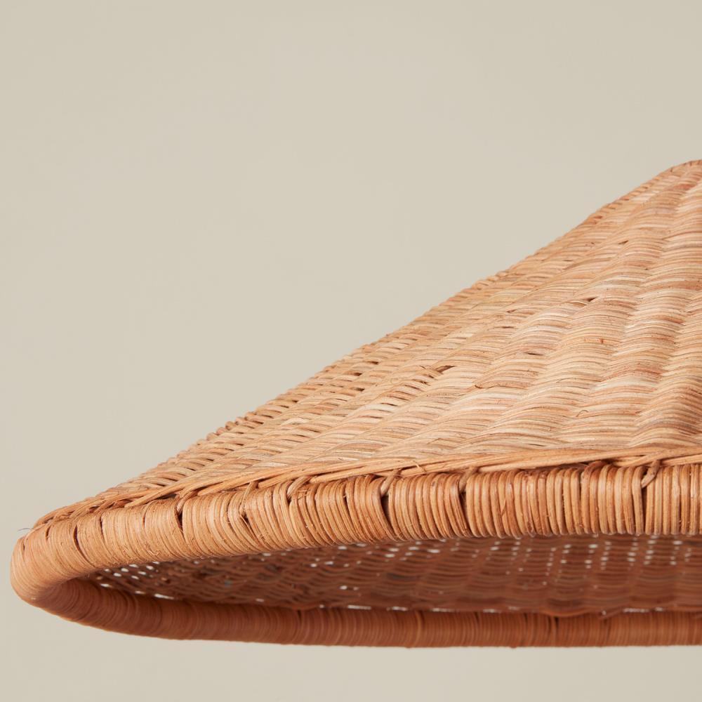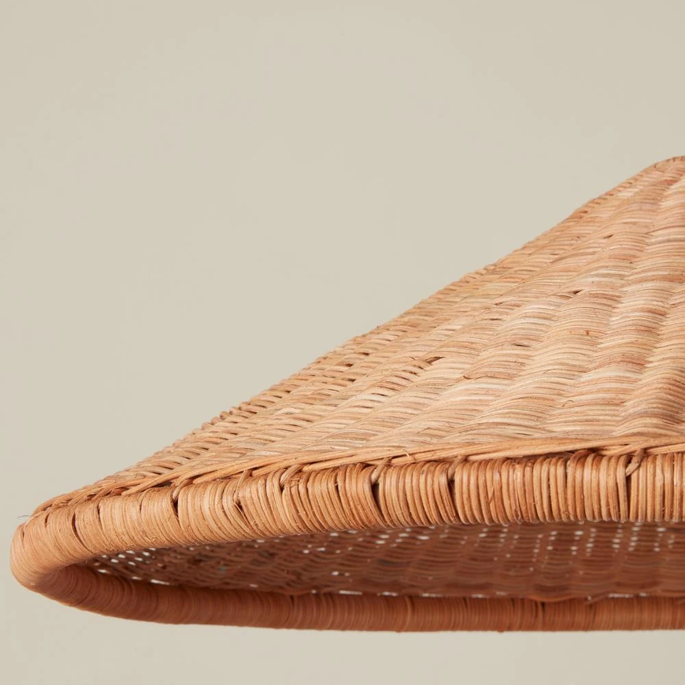 • Features handwoven shade from sustainably harvested rattan