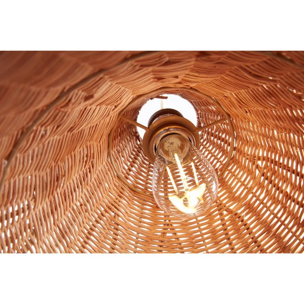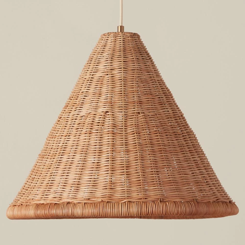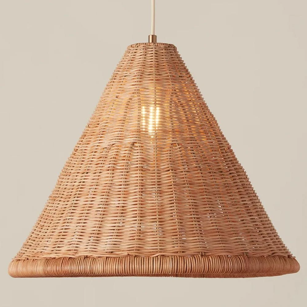 • Features handwoven shade from sustainably harvested rattan