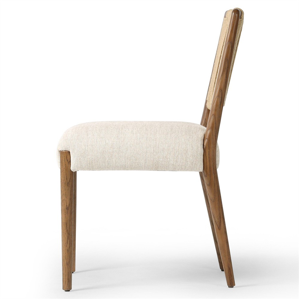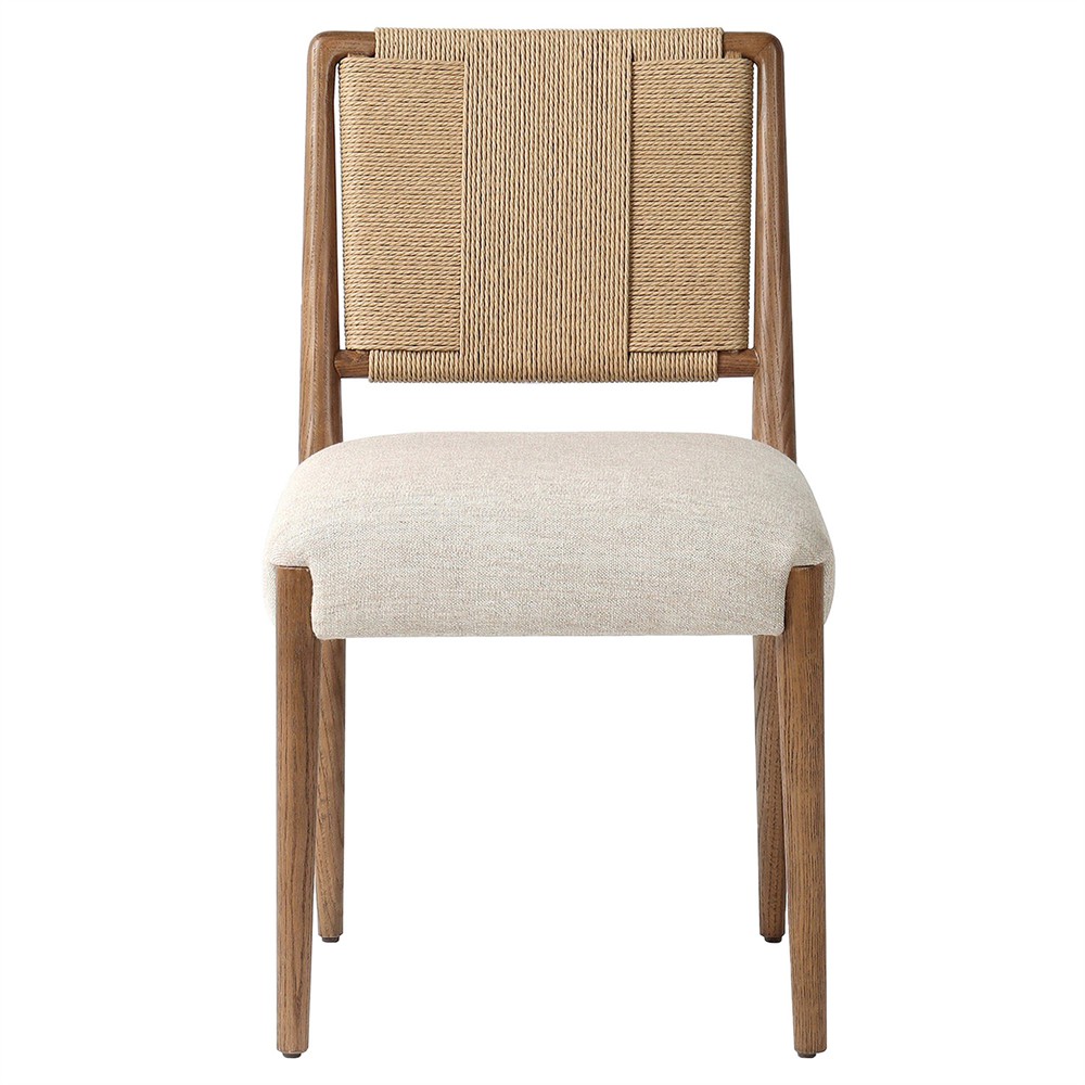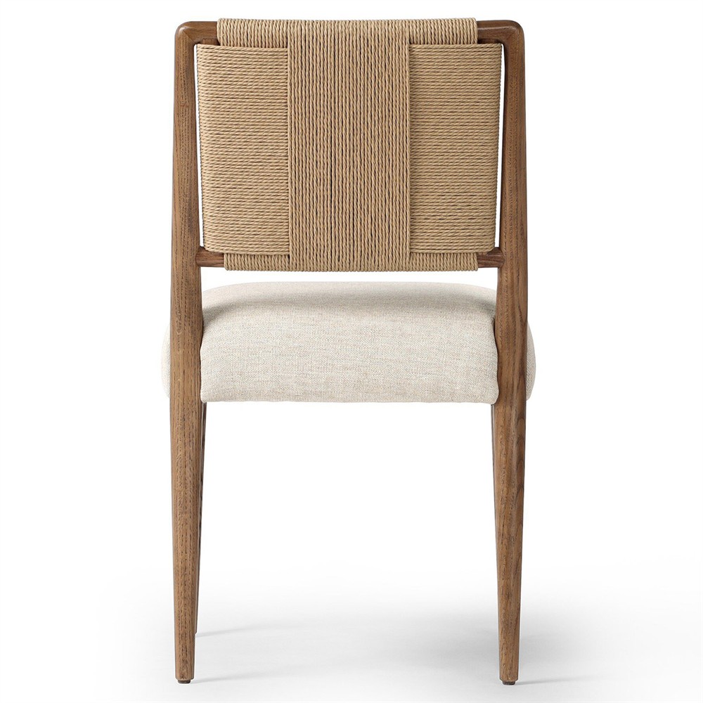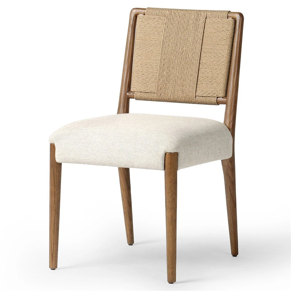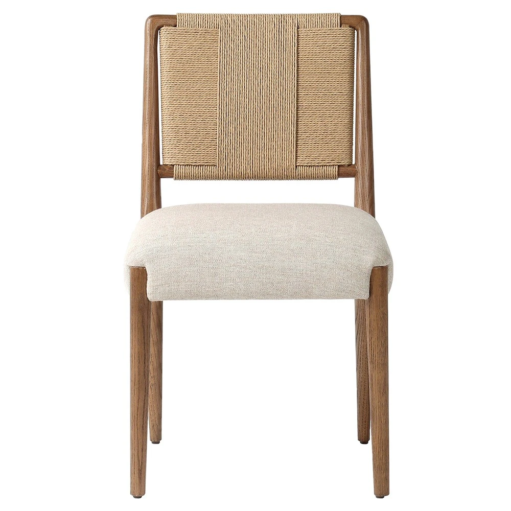 Ronan Coastal Beige Upholstered Seat Woven Rush Brown Oak Wood Dining Side Chair