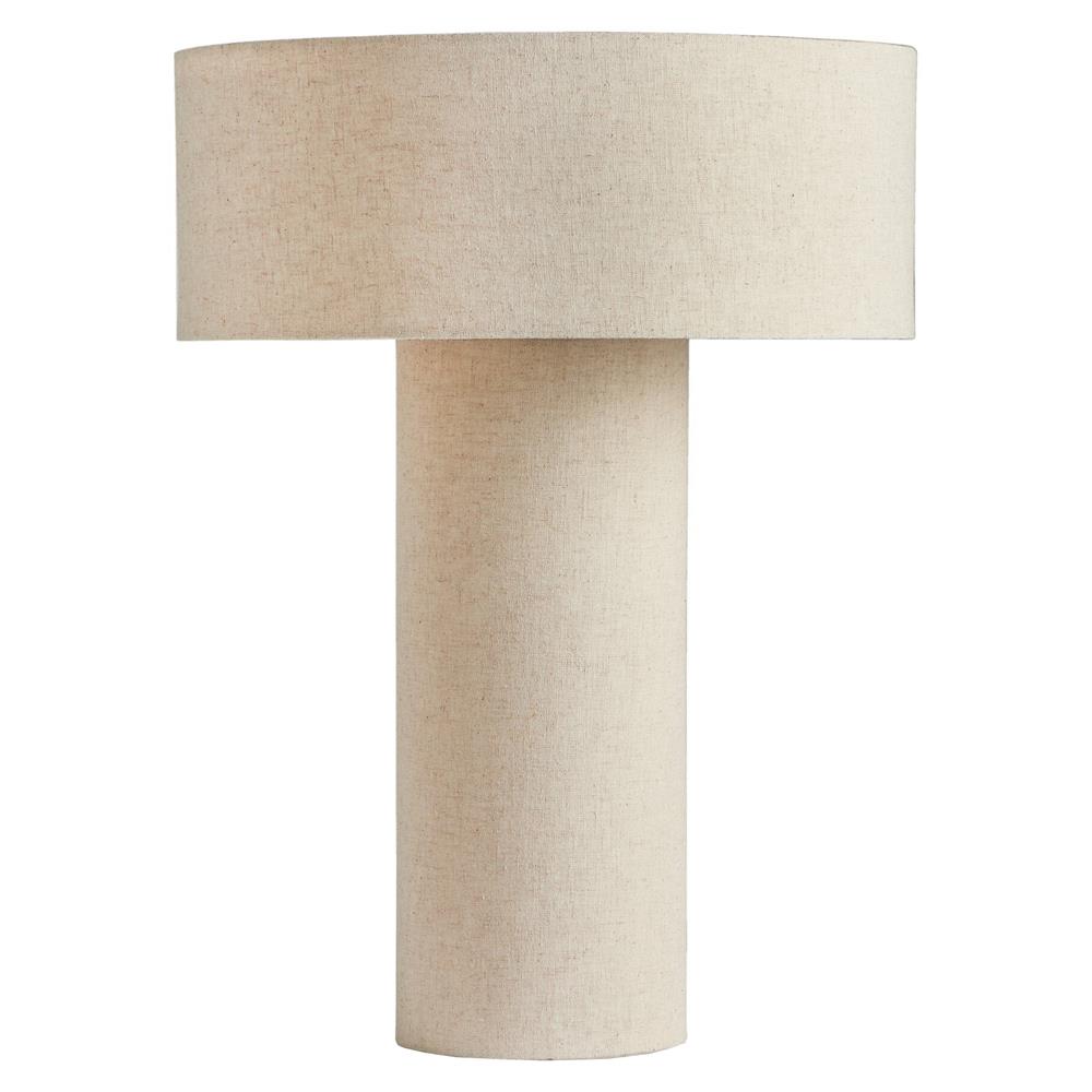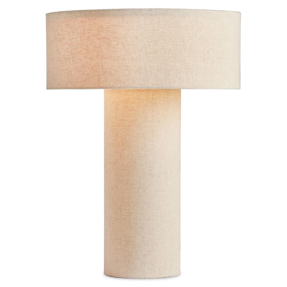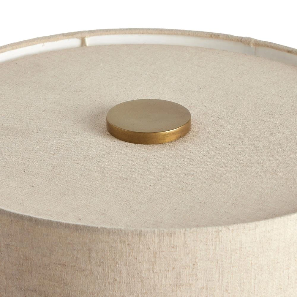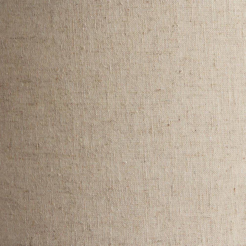 • Features beige flax linen covers a classic cylindrical base, topped with a round, low drum shade. Brass rotary and finial detail on top break up the all-linen look