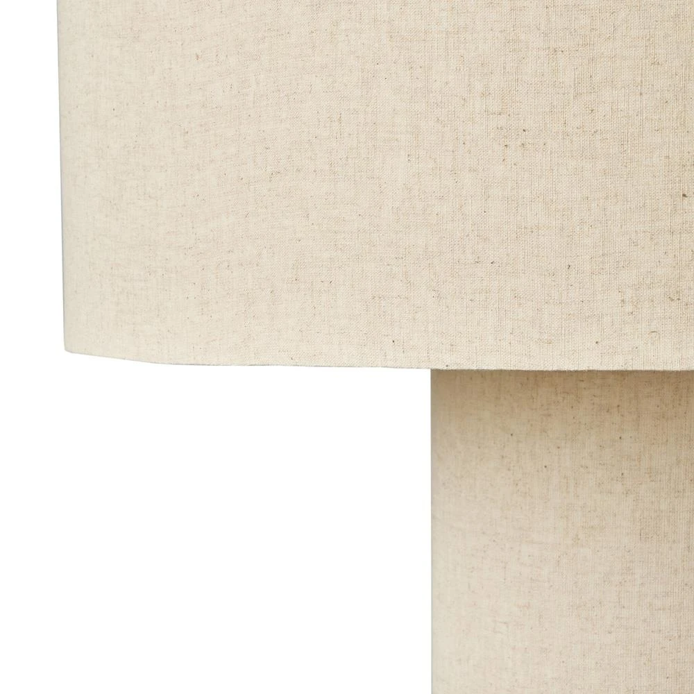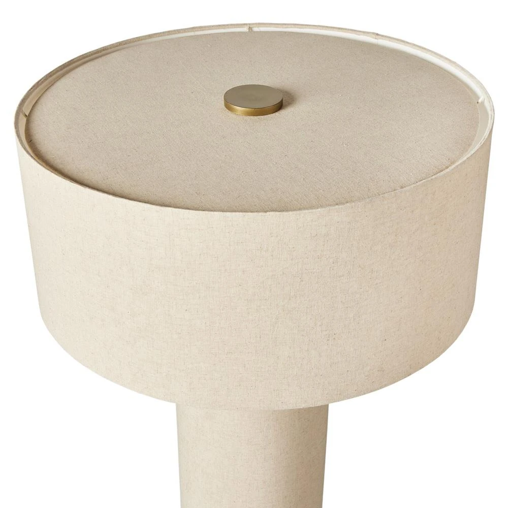 • Features beige flax linen covers a classic cylindrical base, topped with a round, low drum shade. Brass rotary and finial detail on top break up the all-linen look
