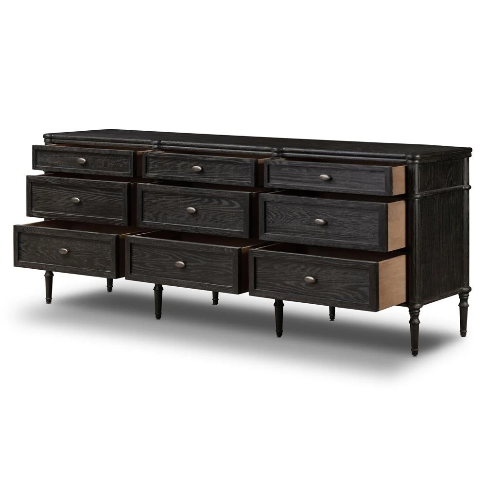The Tacorey Rustic Lodge Black Solid Oak Wood 9 Drawer Dresser nine-drawer dresser features beautifully carved details on a modern silh ... more