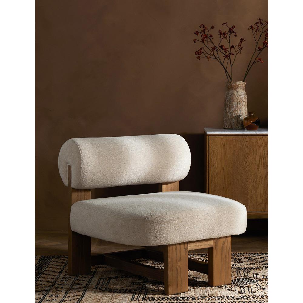 • Samuel French Country Beige Performance Boucle Brown Wood Swivel Arm Chair|Kathy Kuo Home