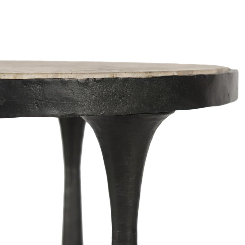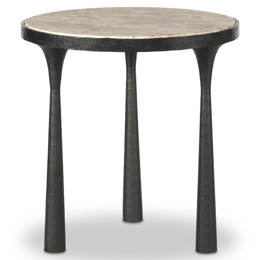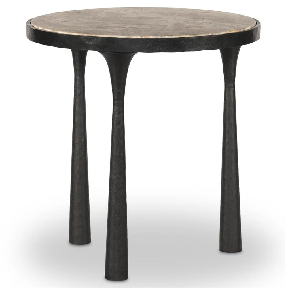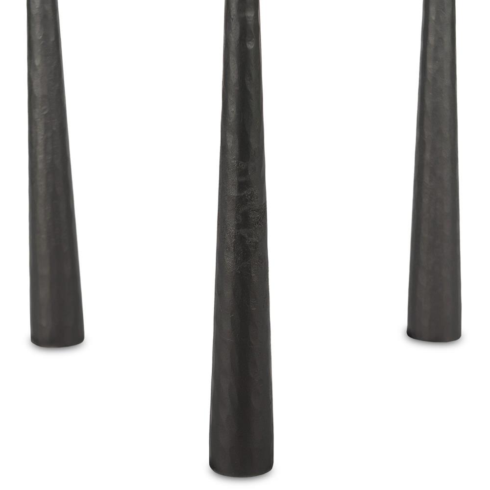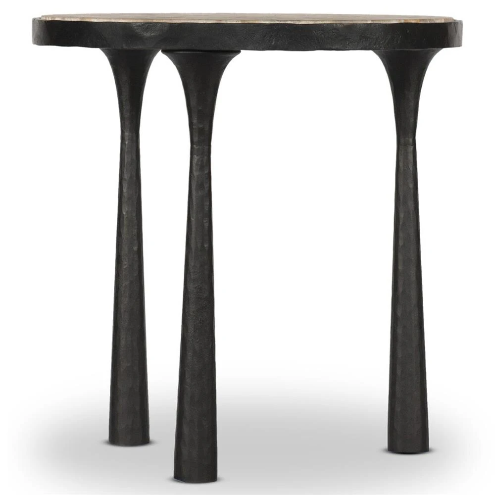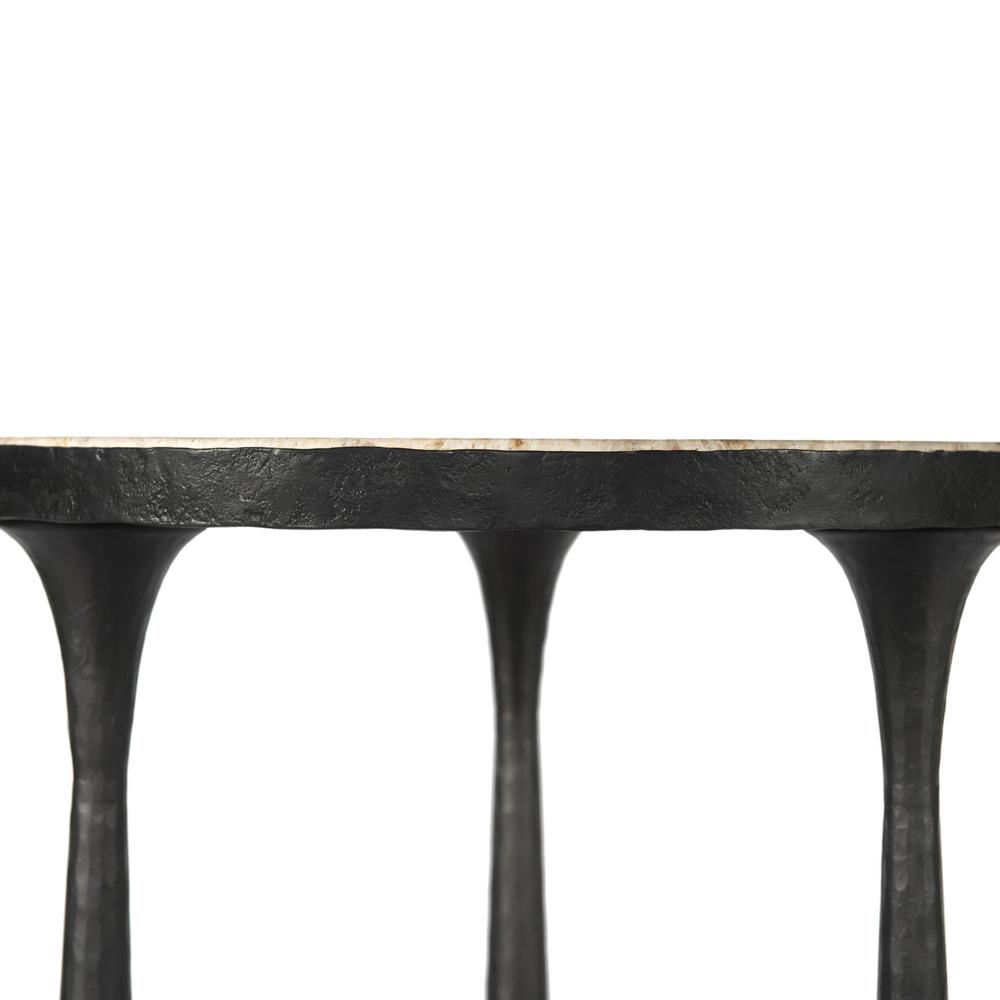• Features 3 tapered hourglass-shaped legs with a hammered gunmetal finish and a marble top