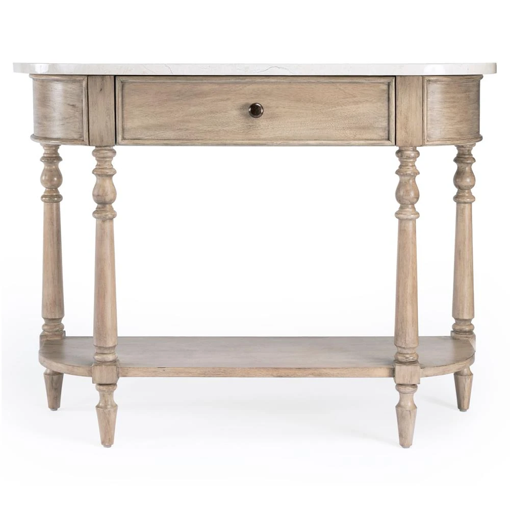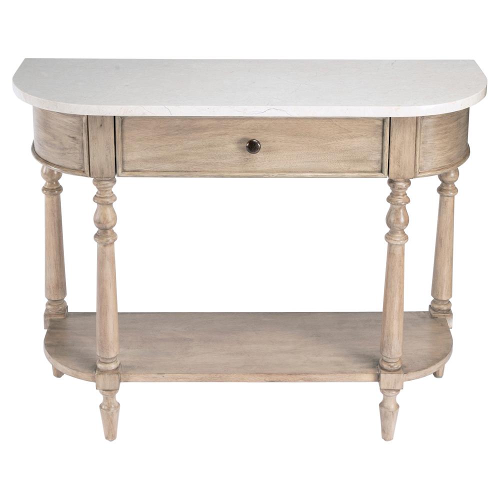 Florentine French Country White Marble Beige Wood Demilune Console Table