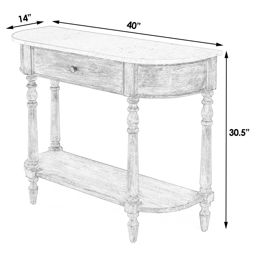 • Marble Top: 0.75 inches high x 40 inches wide x 14 inches deep; Drawer: 5.5 inches high x 24 inches wide x 14 inches deep; Shelf Back Legs: 36 inches; Between Front Legs: 26.5 inches deep; Shelf to Top of Apron Base: 25 inches high; Weight Capacity: 500 pounds
