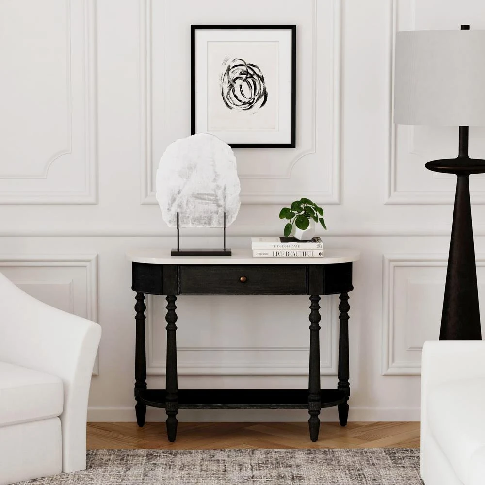 Florentine French Country White Marble Black Wood Demilune Console Table