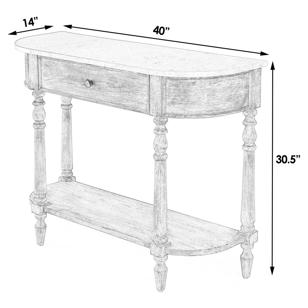 • Marble Top: 0.75 inches high x 40 inches wide x 14 inches deep; Drawer: 5.5 inches high x 24 inches wide x 14 inches deep; Shelf Back Legs: 36 inches; Between Front Legs: 26.5 inches deep; Shelf to Top of Apron Base: 25 inches high; Weight Capacity: 500 pounds