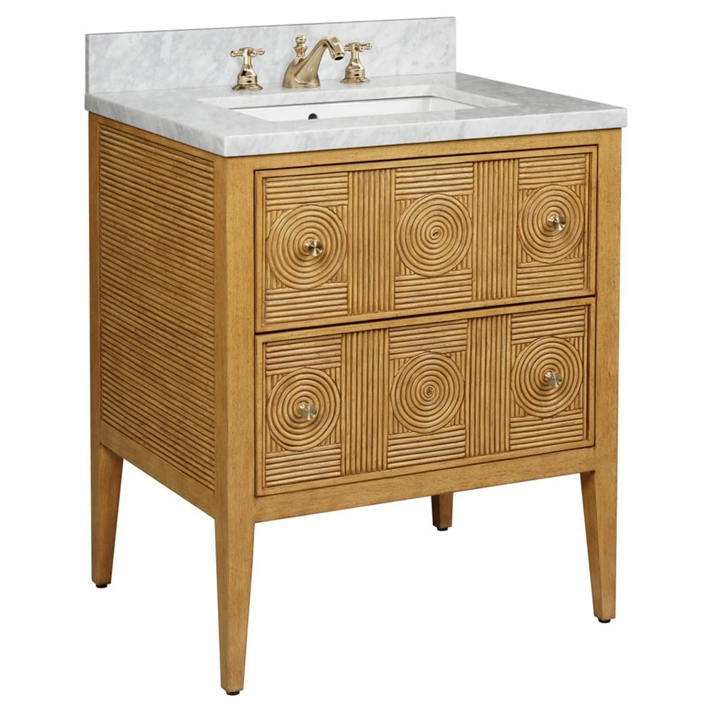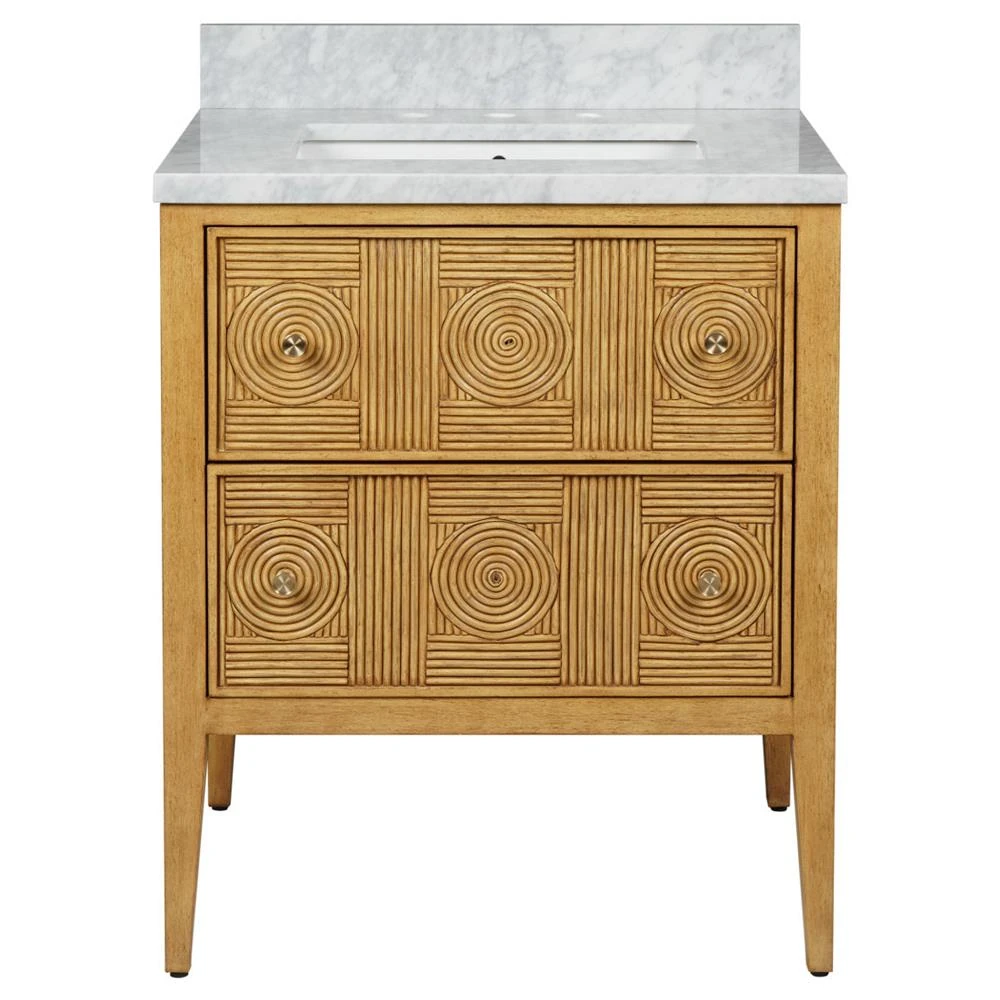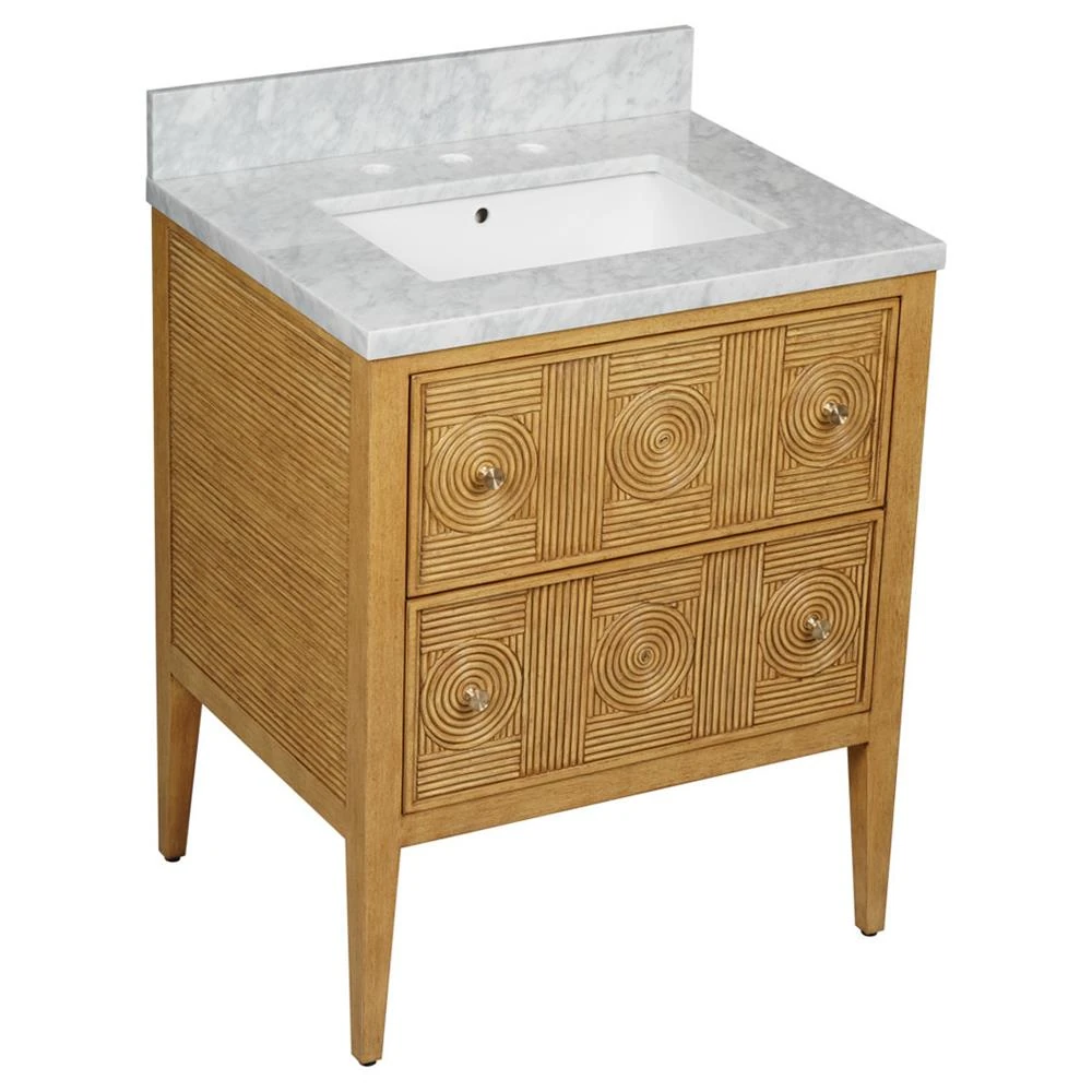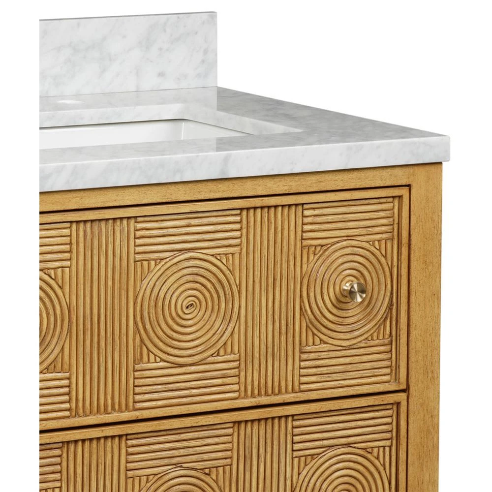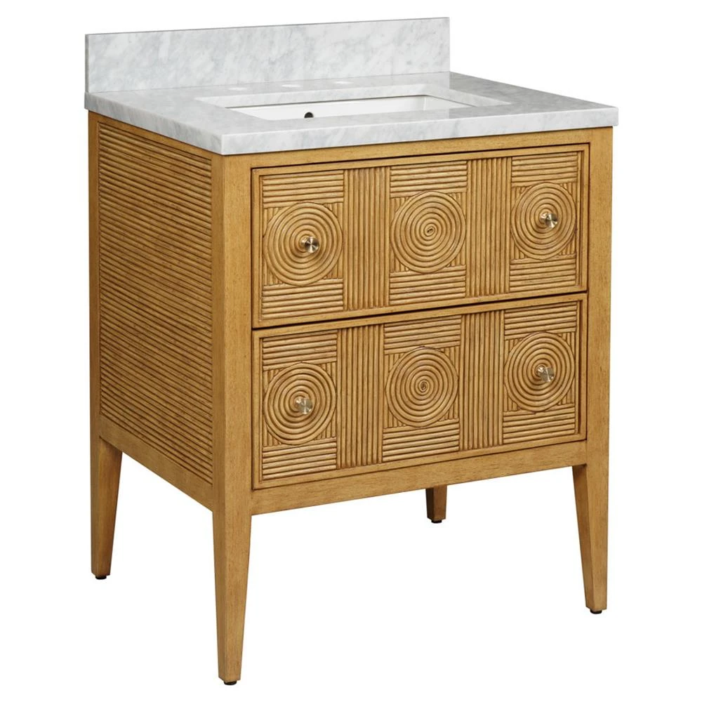 • Bella Coastal Beach White Carrara Marble Navy Rattan Vanity Sink - 28"|Kathy Kuo Home