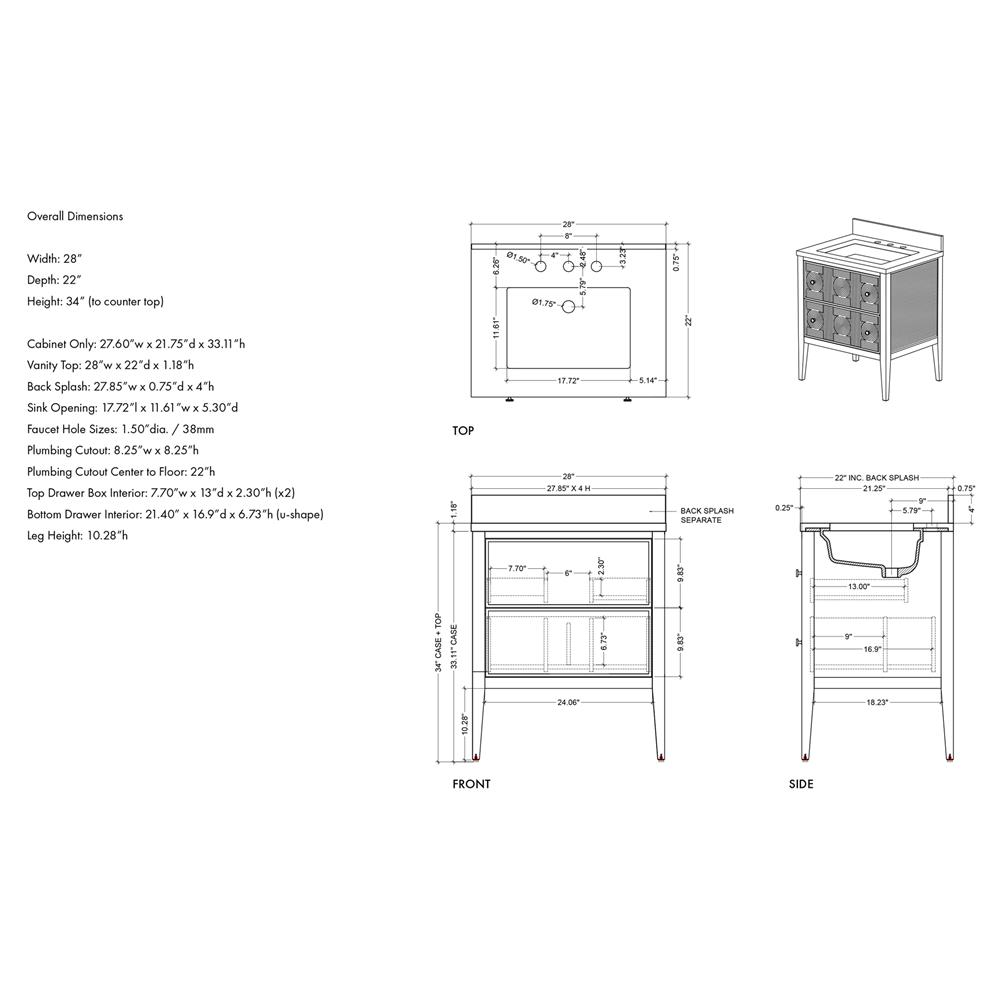 • Counter: 1.18 inches high x 28 inches wide x 22 inches deep; Backsplash: 4 inches high x 27.875 inches wide x 0.75 inches deep; Side splash: 4 inches high x 22 inches wide x 0.75 inches deep; Sink: 17.75 inches (length) x 11.6 inches wide x 5.669 inches deep