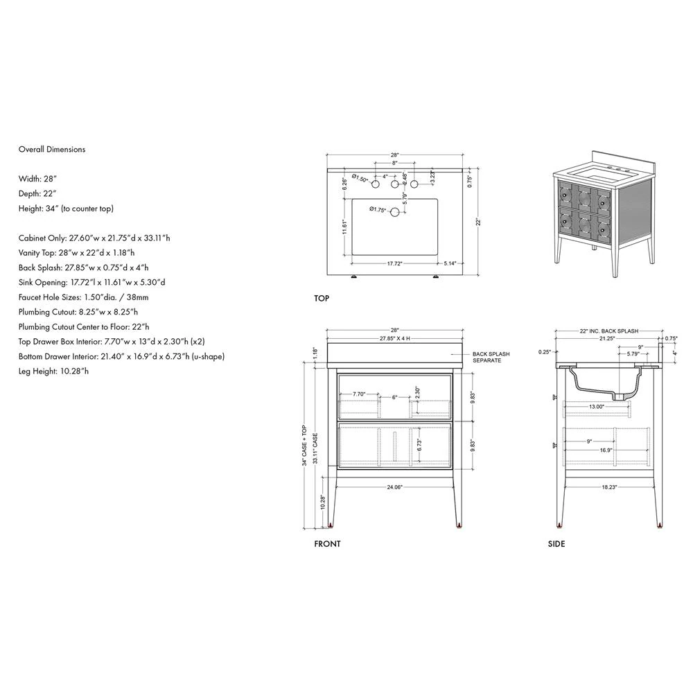 • Counter: 1.18 inches high x 28 inches wide x 22 inches deep; Backsplash: 4 inches high x 27.875 inches wide x 0.75 inches deep; Side splash: 4 inches high x 22 inches wide x 0.75 inches deep; Sink: 17.75 inches (length) x 11.6 inches wide x 5.669 inches deep