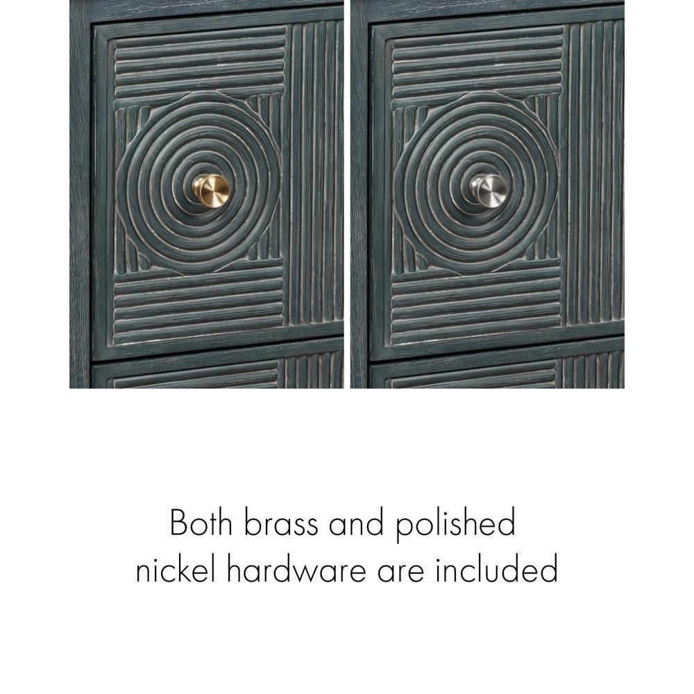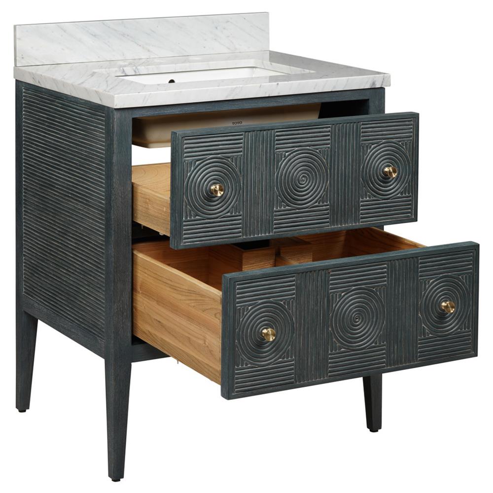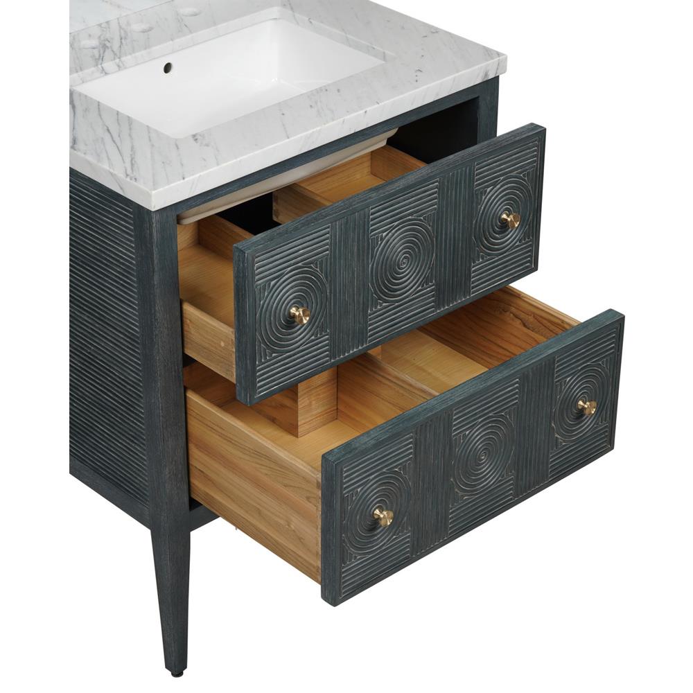 • Features 2 soft-close drawers with brushed brass knobs; Bottom drawer has a removable organizational divider; Removable matching marble backsplash