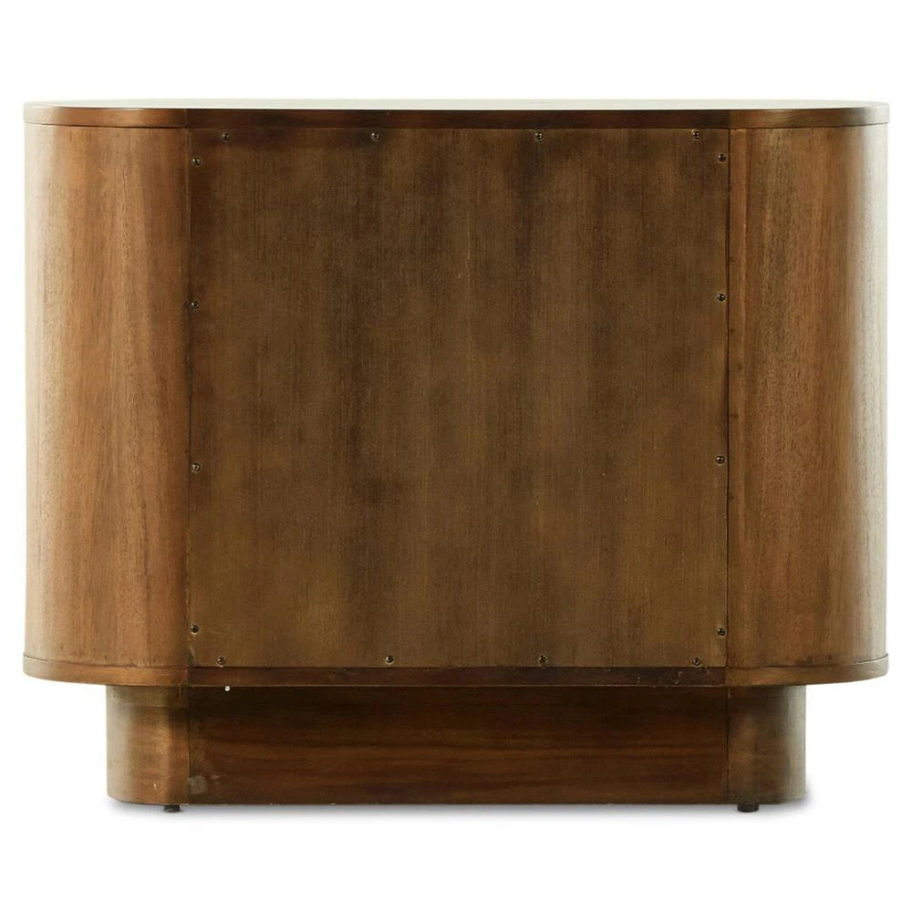 • Features 2 soft-closing drawers with English dovetail joinery; Curved pedestal base