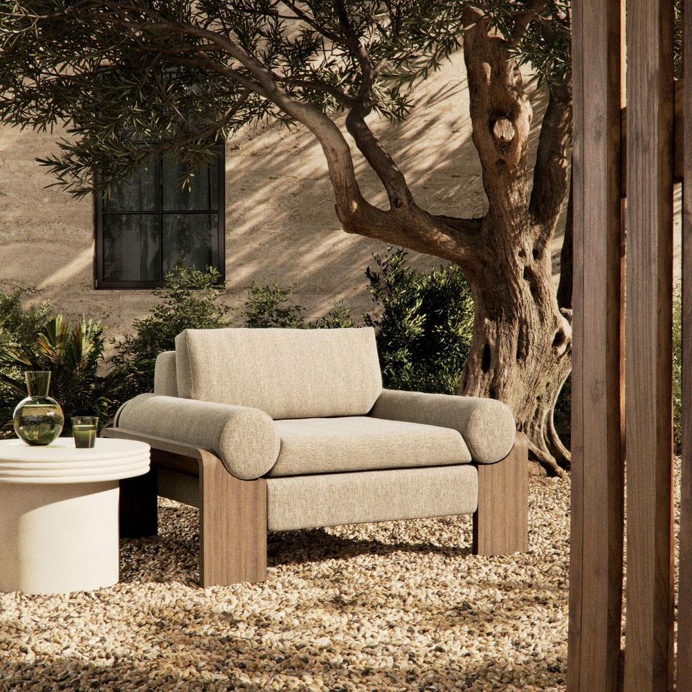 • Sandari Modern Classic Brown Upholstered Teak Outdoor Chair|Kathy Kuo Home