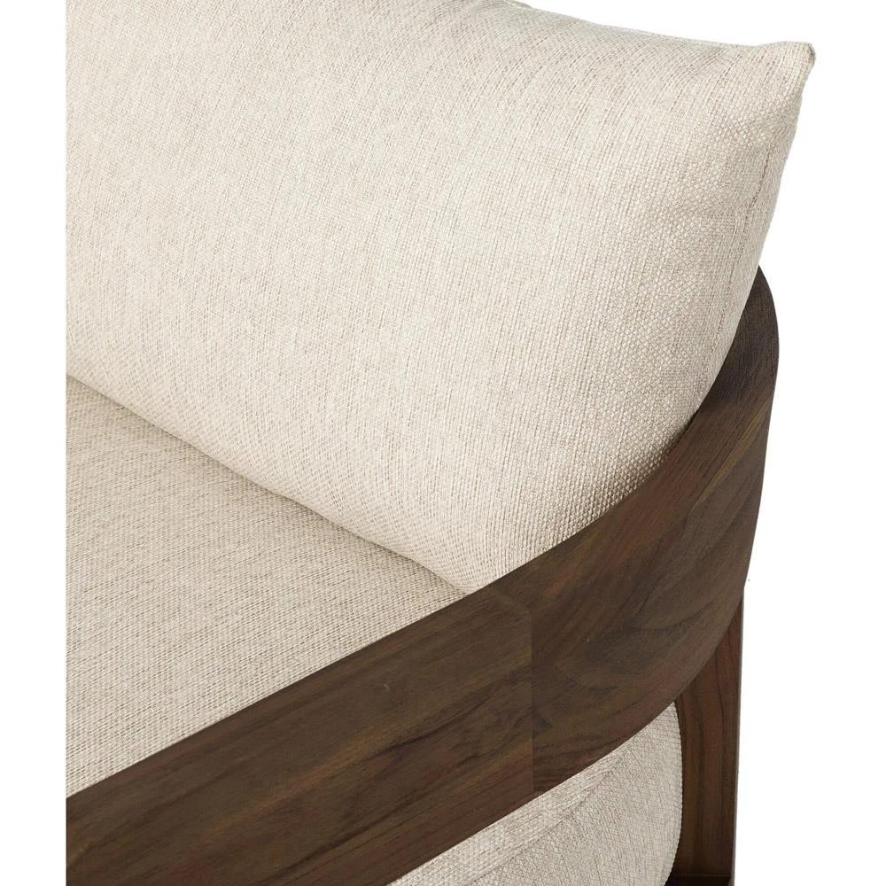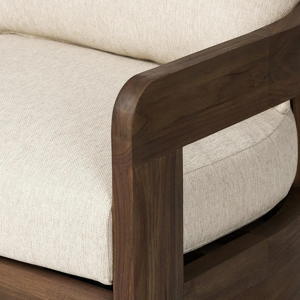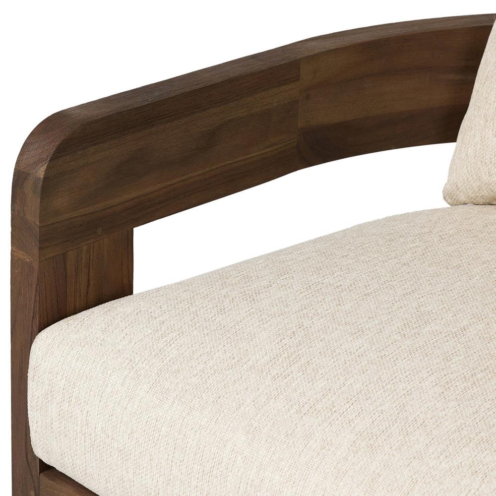 • Aviel Rustic Lodge Beige Upholstered Teak Outdoor Barrel Arm Chair|Kathy Kuo Home