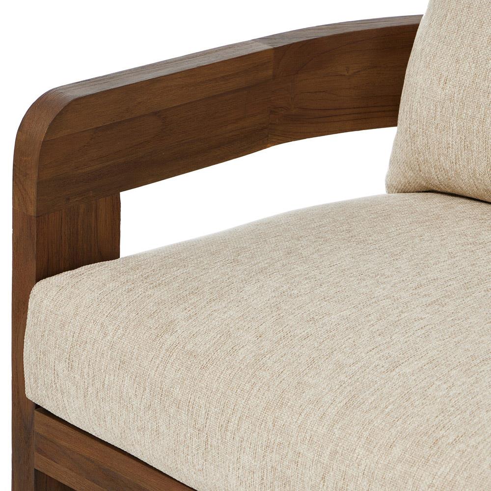 • Aviel Rustic Lodge Beige Upholstered Teak Outdoor Barrel Arm Chair|Kathy Kuo Home