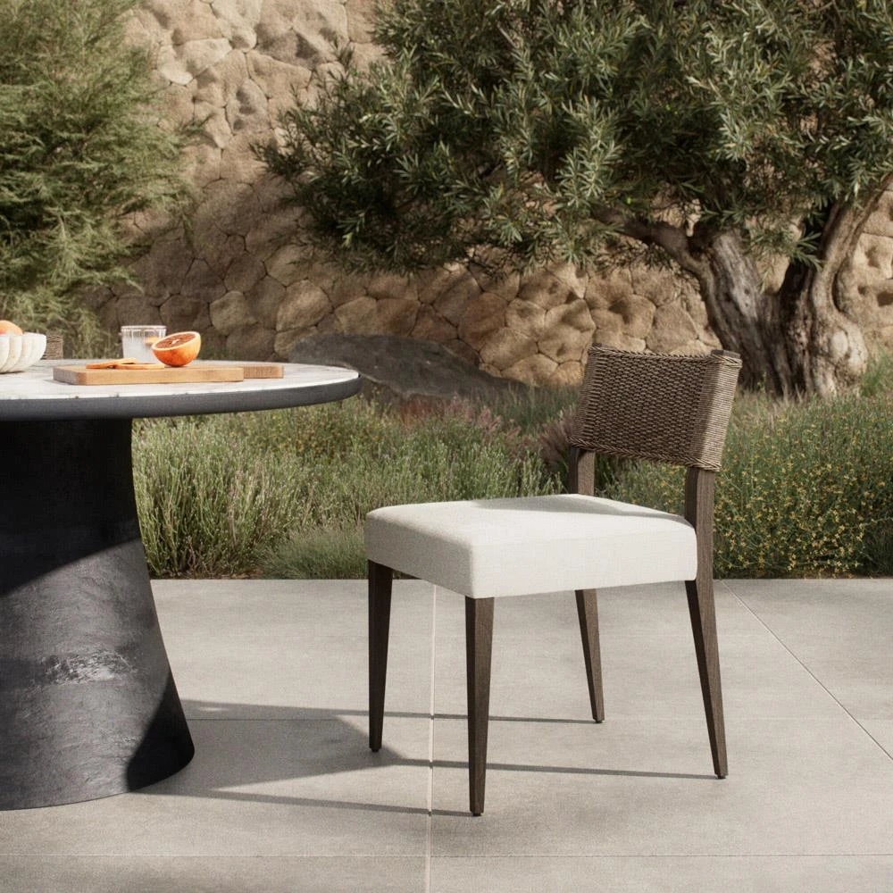 • Wanda Mid Century Modern Grey Teak Beige Rattan Outdoor Dining Chair|Kathy Kuo Home