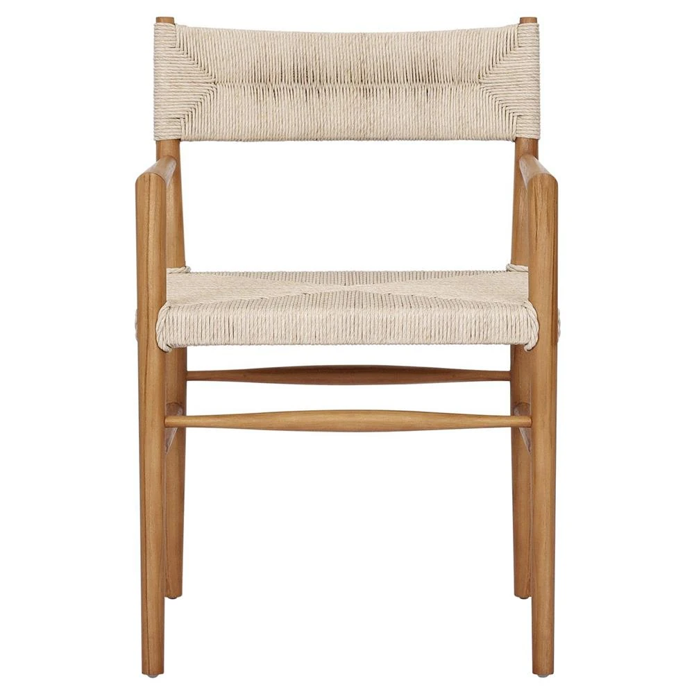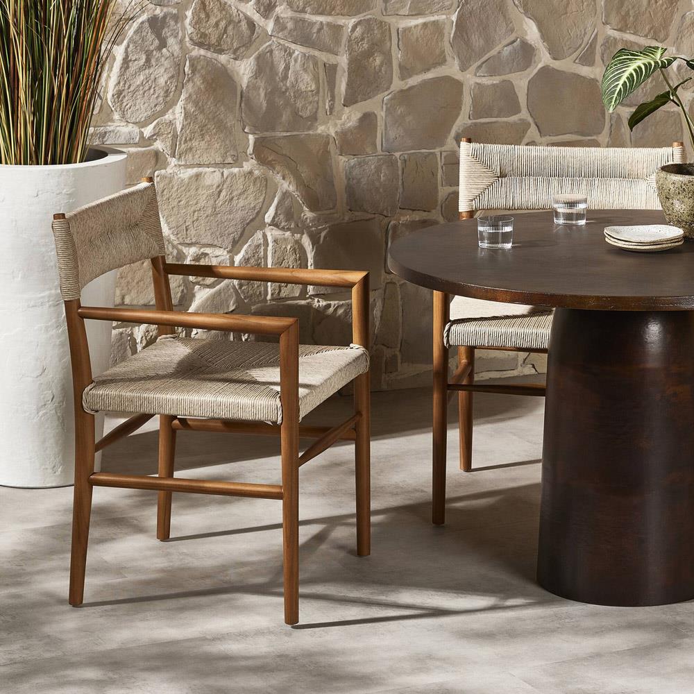 • Cheryl Modern Light Grey Cushion Woven Rope Natural Teak Outdoor Dining Arm Chair|Kathy Kuo Home