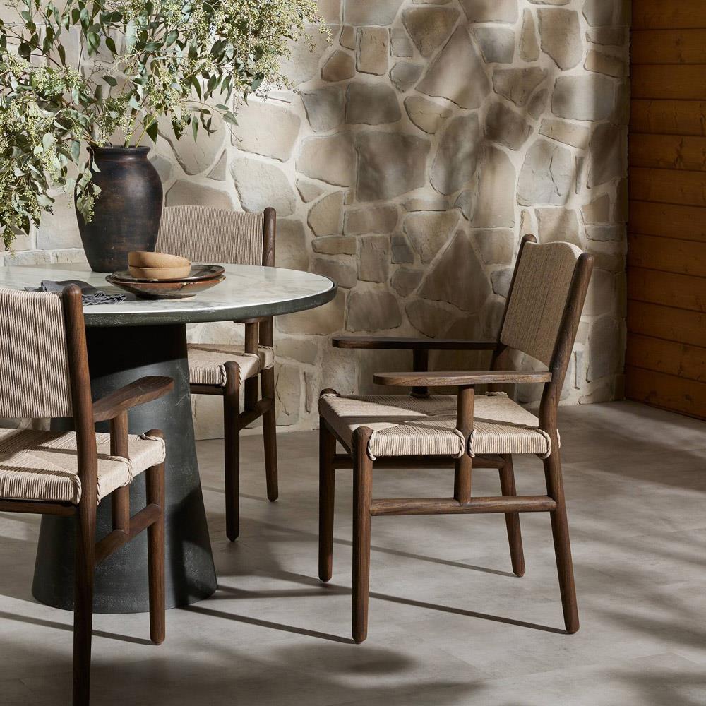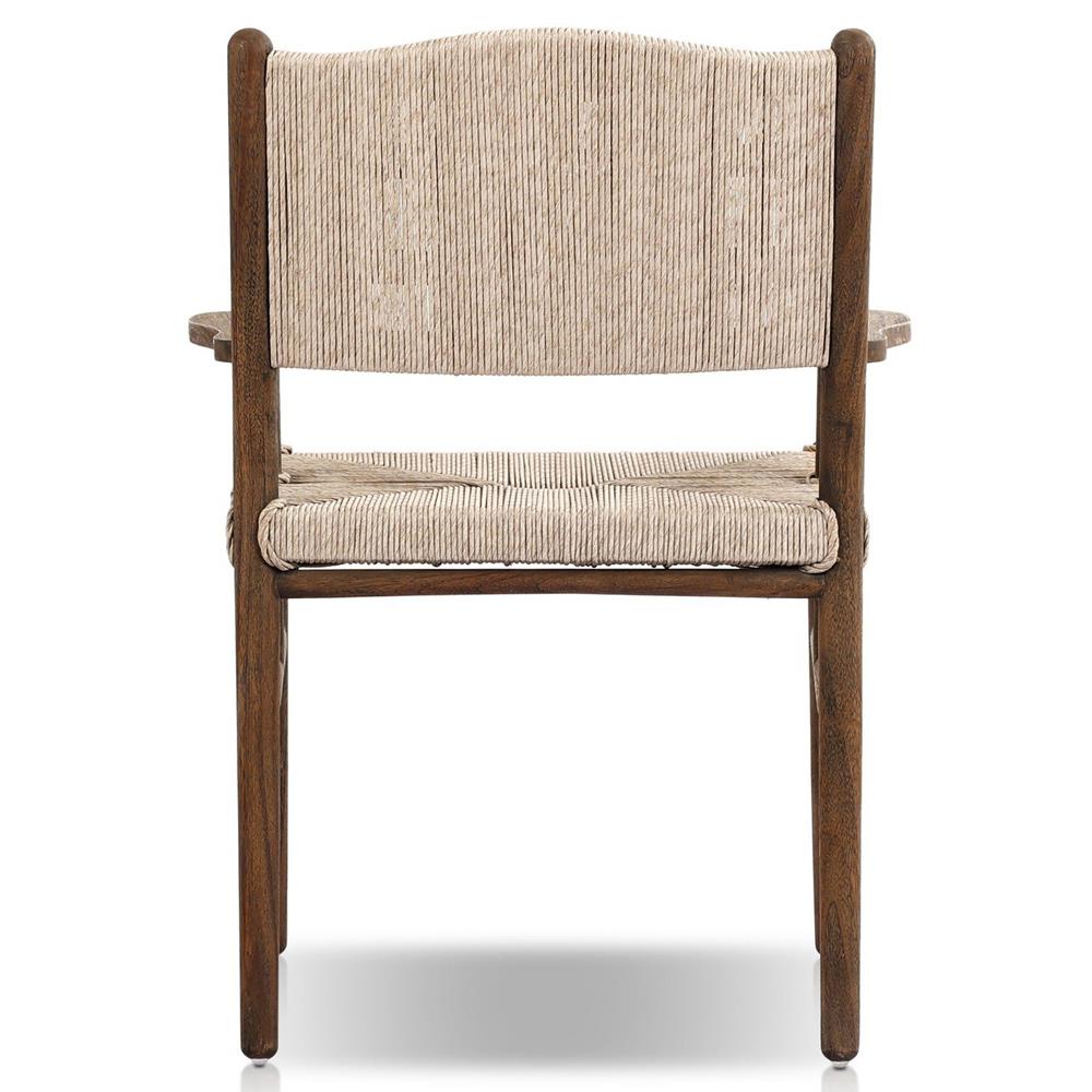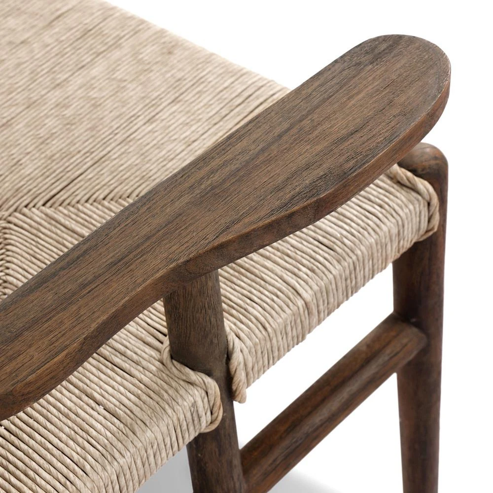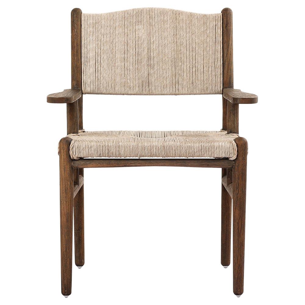 • Cheryl Modern Light Grey Cushion Woven Rope Natural Teak Outdoor Dining Arm Chair|Kathy Kuo Home