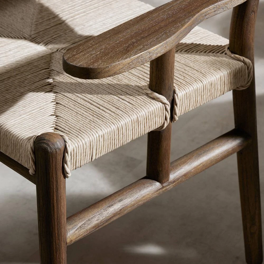 Cheryl Modern Light Grey Cushion Woven Rope Natural Teak Outdoor Dining Arm Chair