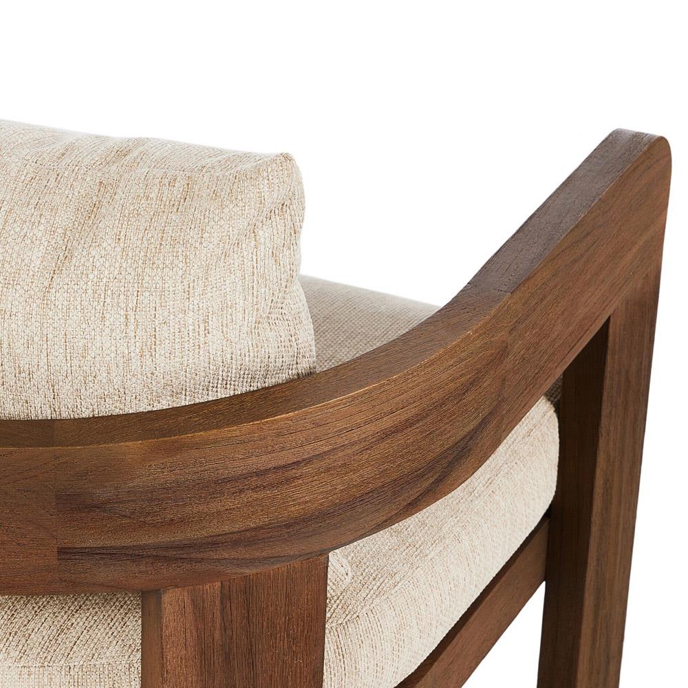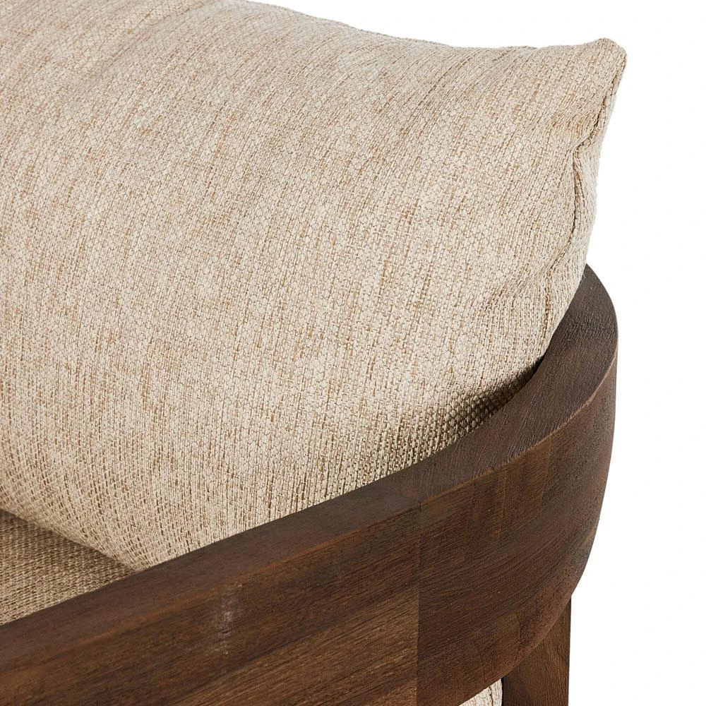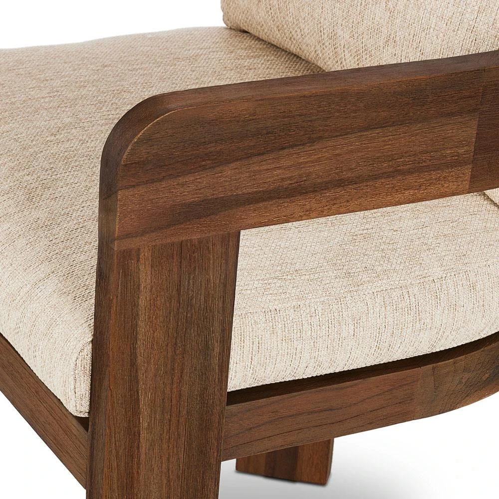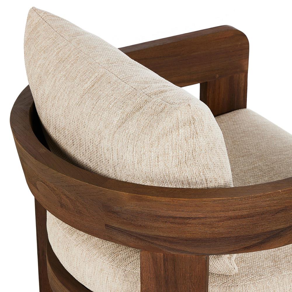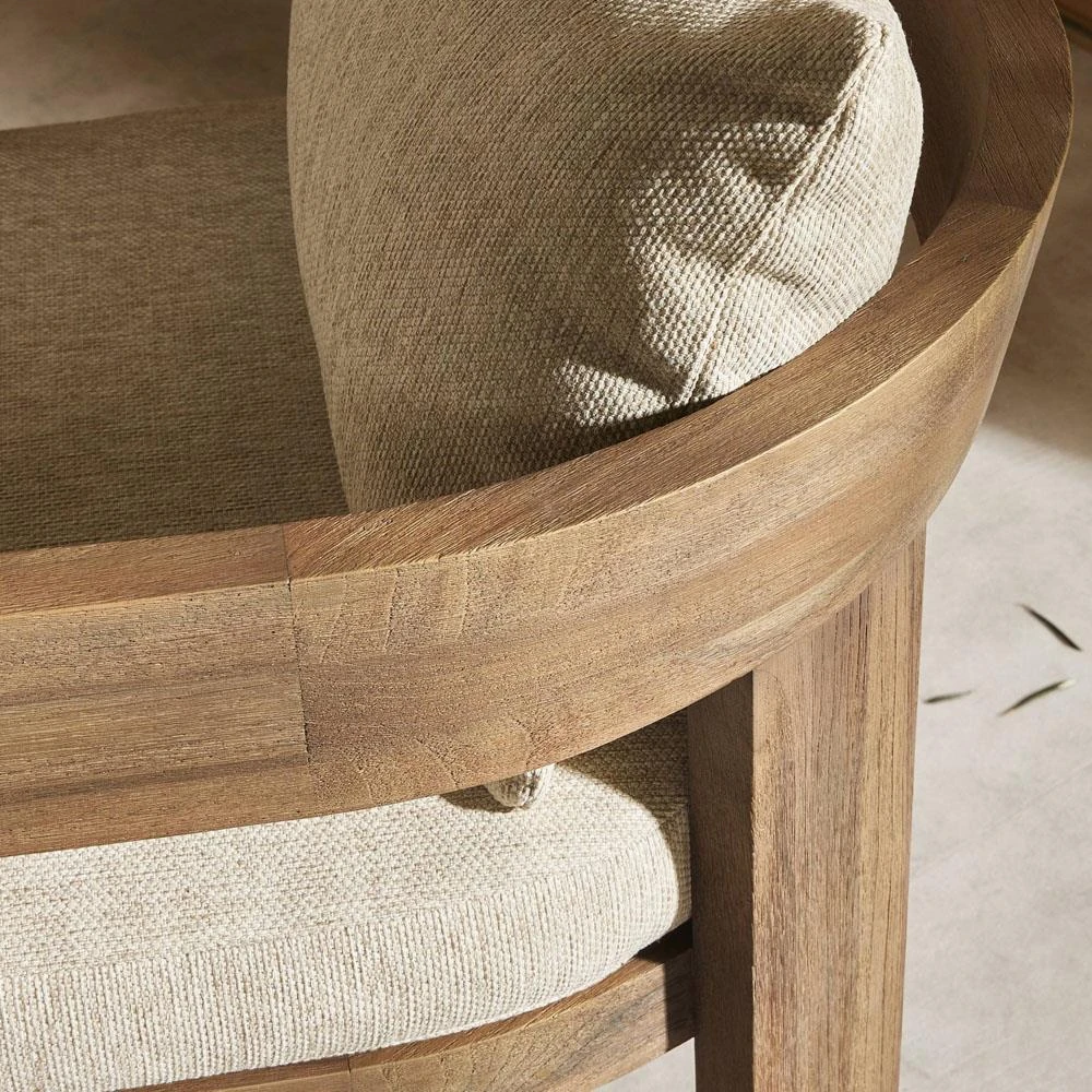 • Aviel Rustic Lodge Beige Upholstered Teak Outdoor Barrel Arm Chair|Kathy Kuo Home