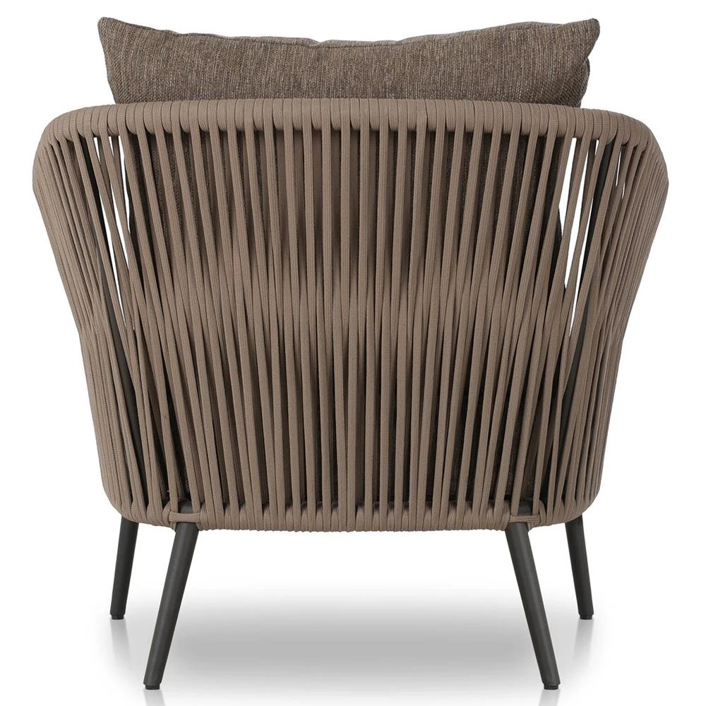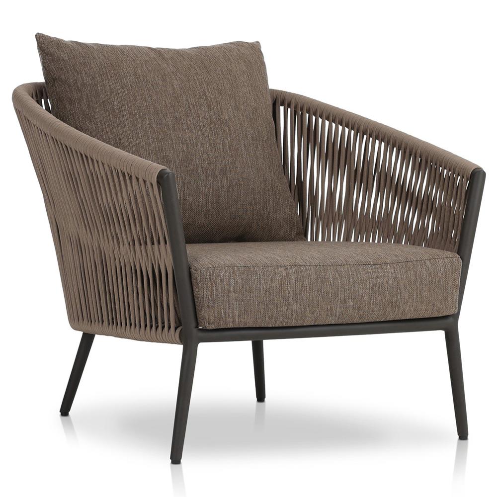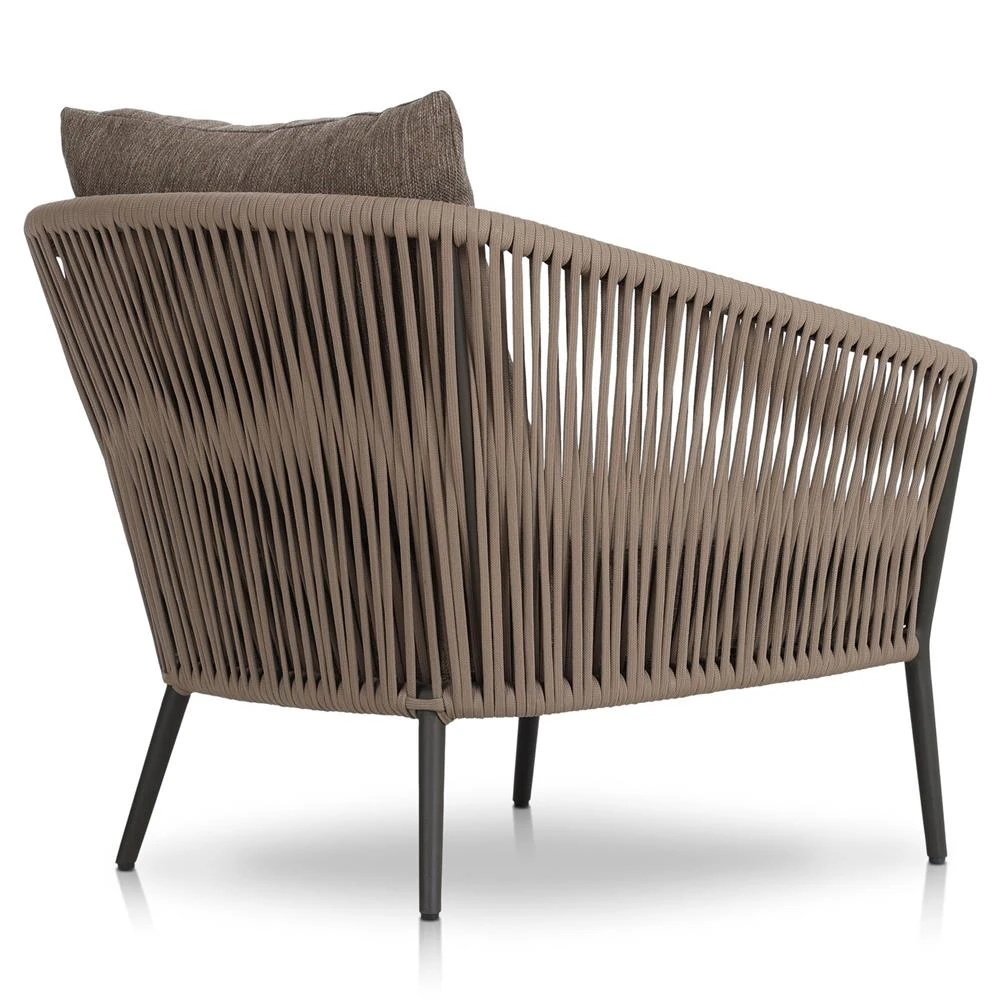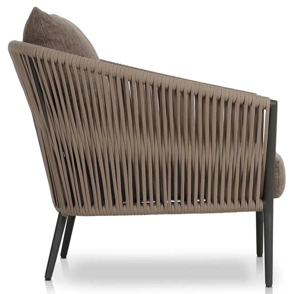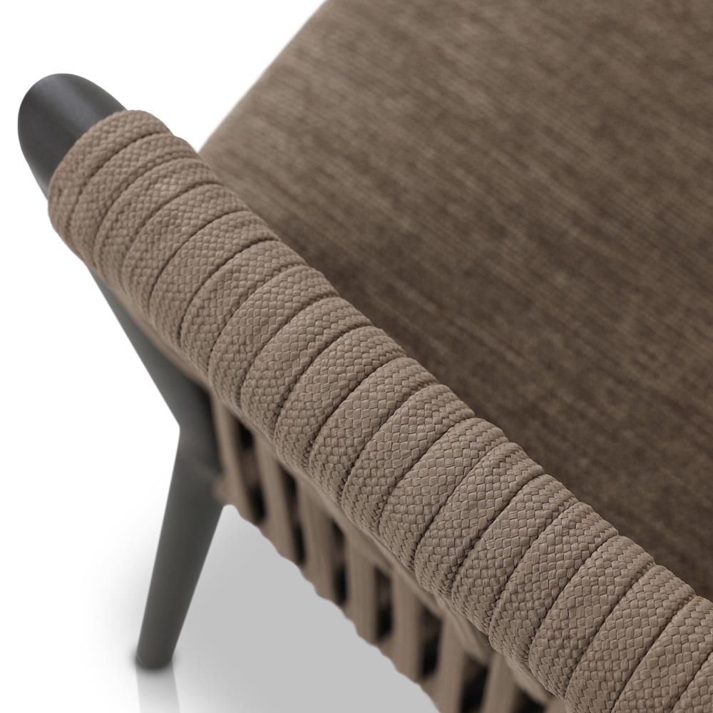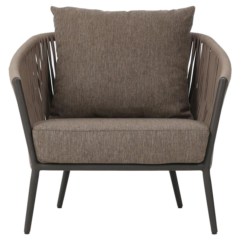• Features a rope-based design woven across a durable aluminum frame, with a box seat cushion and knife-edge back cushion, upholstered in UV-resistant, water-repellent, and quick-drying 100% olefin