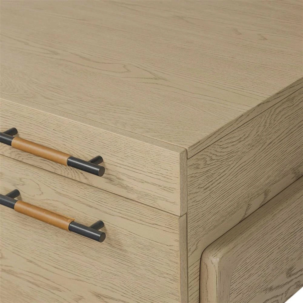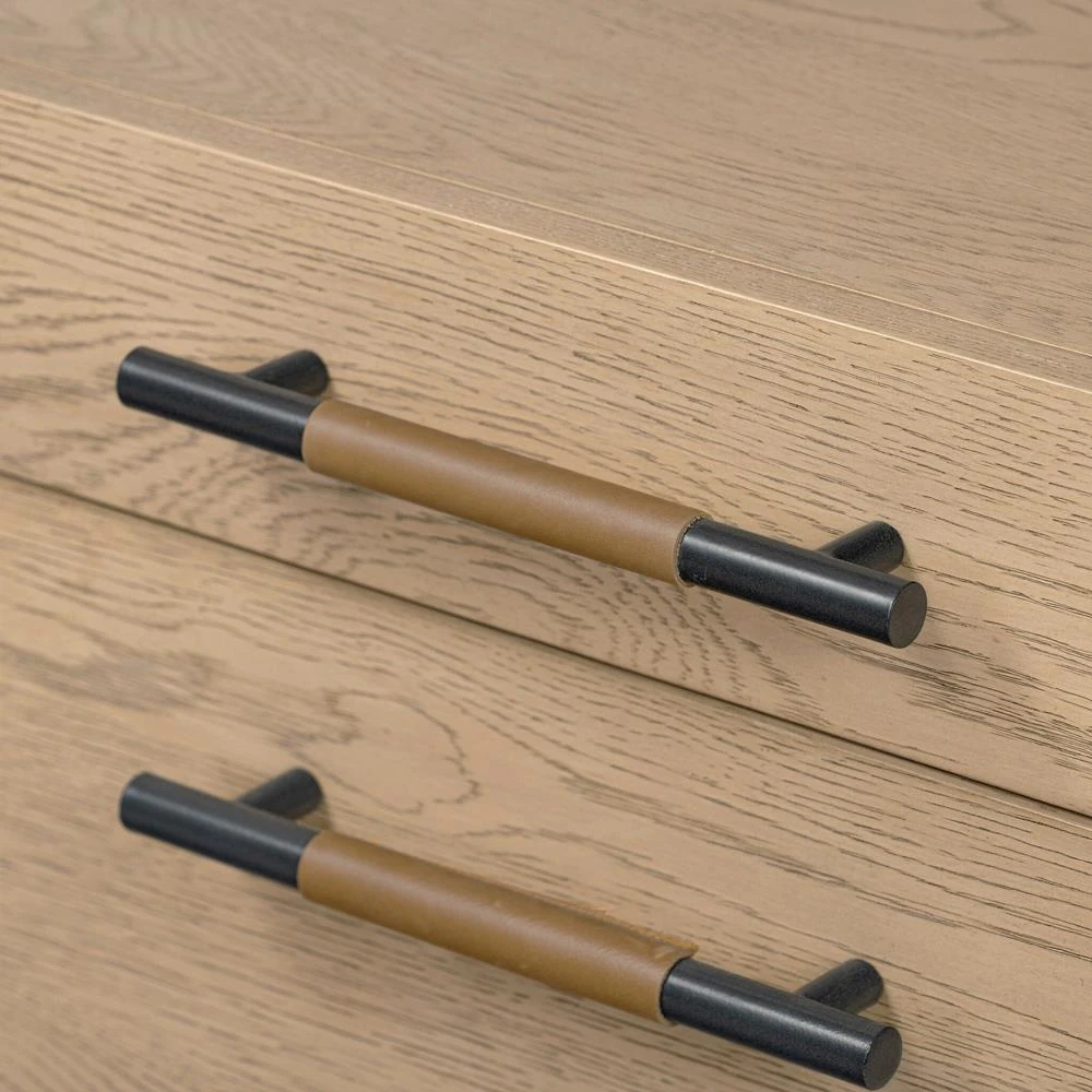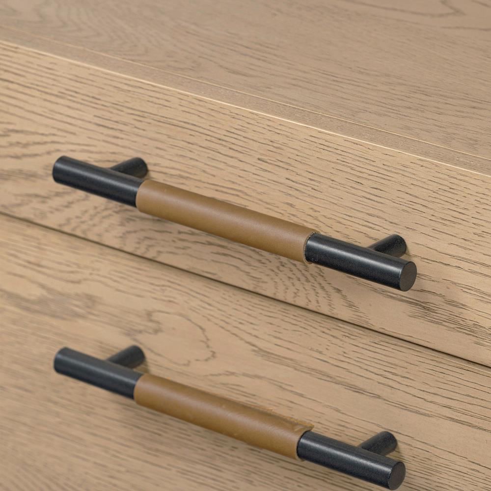 • Features 2 doors and 4 soft-closing drawers with iron hardware wrapped in tan top-grain leather