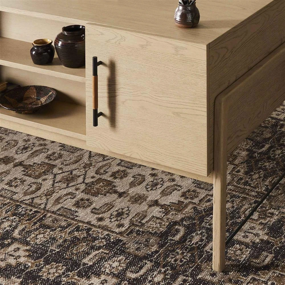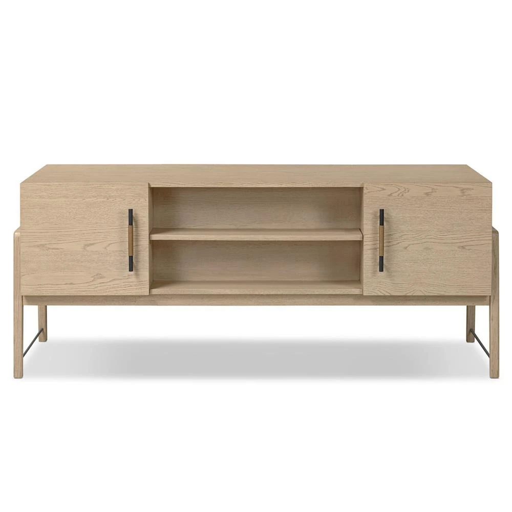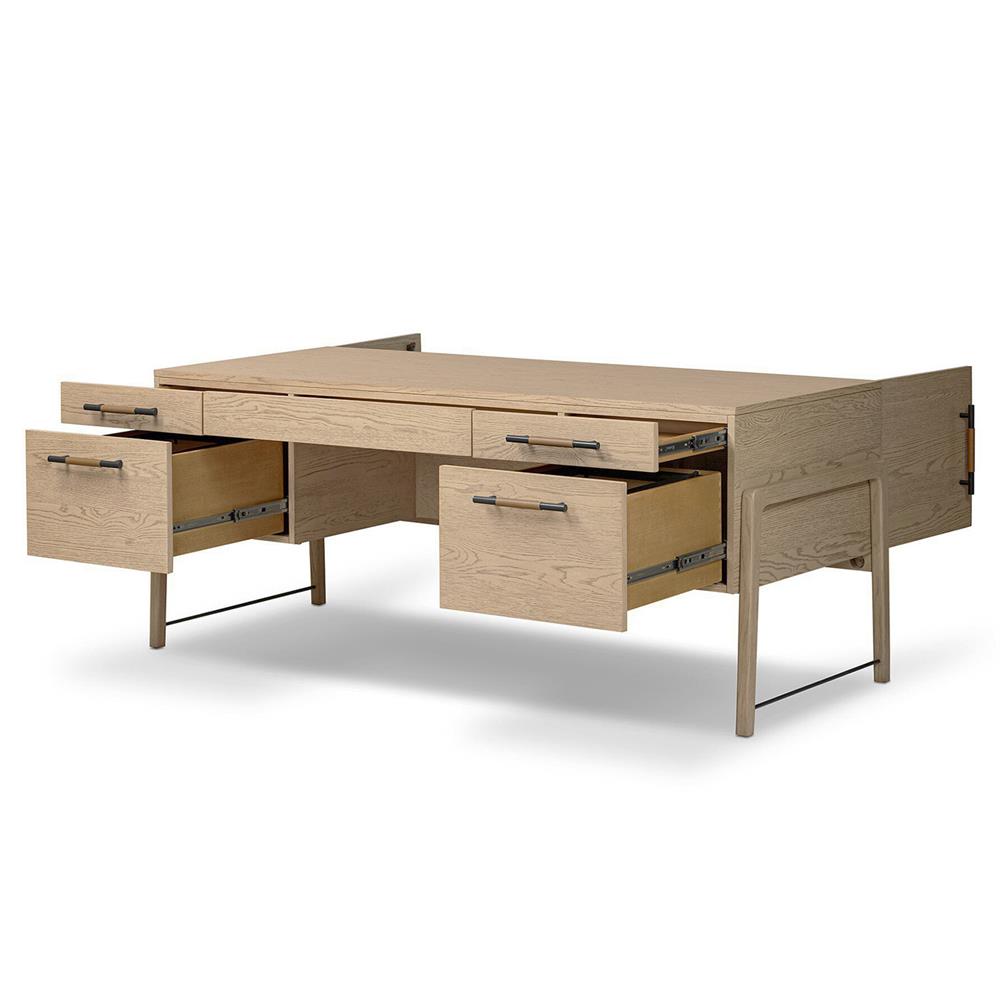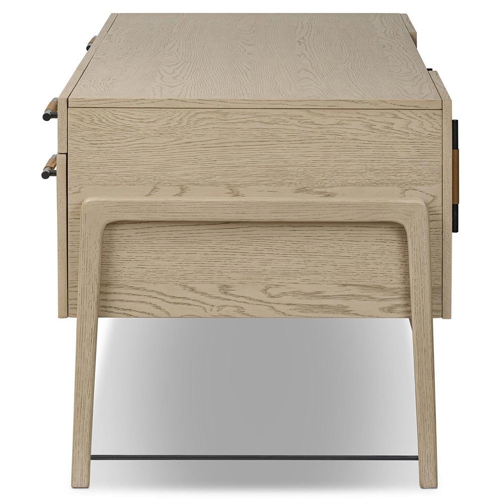 • Features 2 doors and 4 soft-closing drawers with iron hardware wrapped in tan top-grain leather