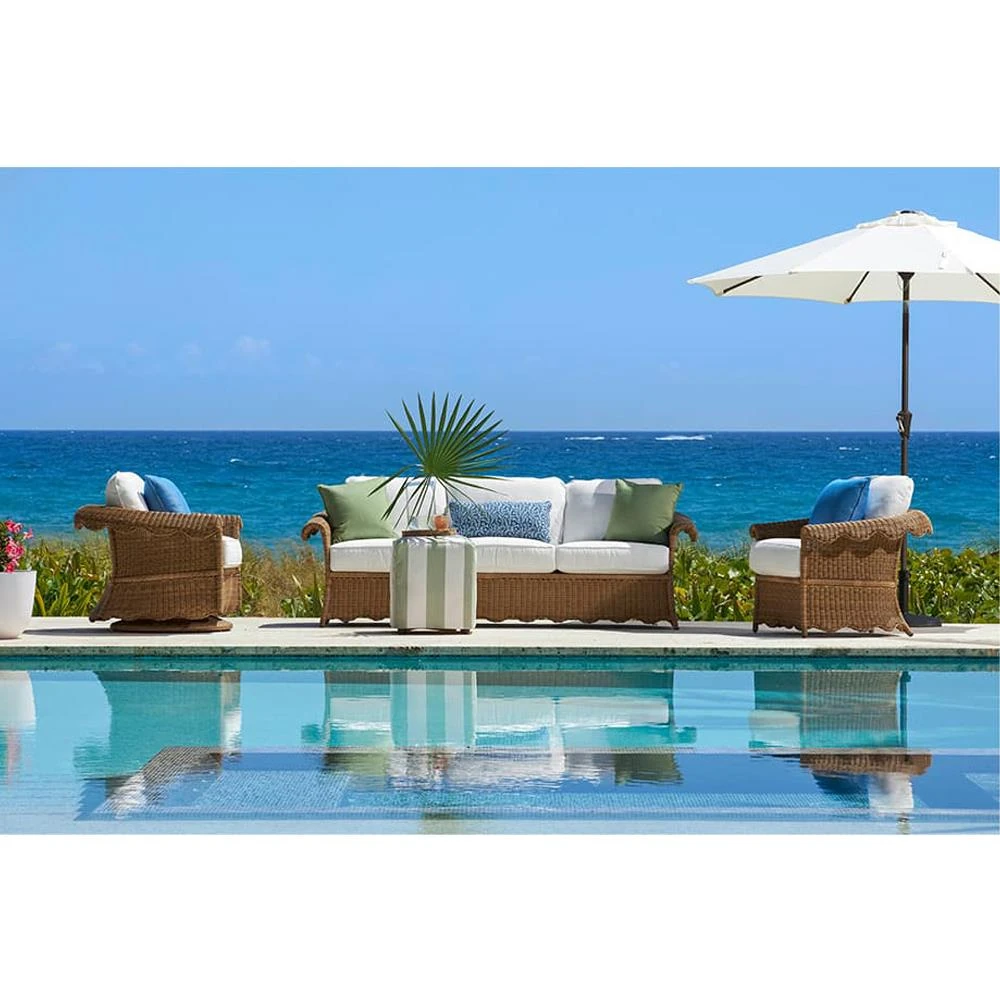 • Cielo Coastal Sand Sunbrella Wicker Scalloped Outdoor Swivel Glider Chair|Kathy Kuo Home