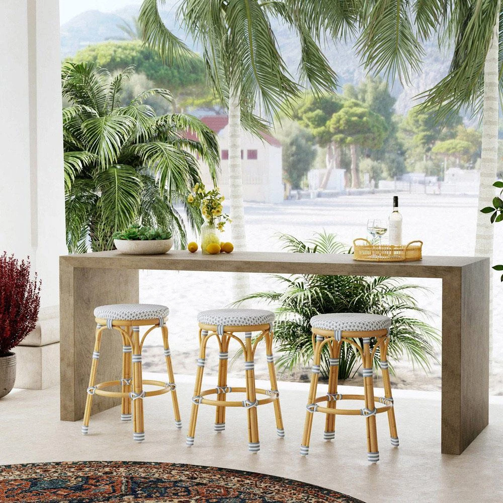 • Lily French Country Blue Woven Rattan Outdoor Backless Counter Stool|Kathy Kuo Home