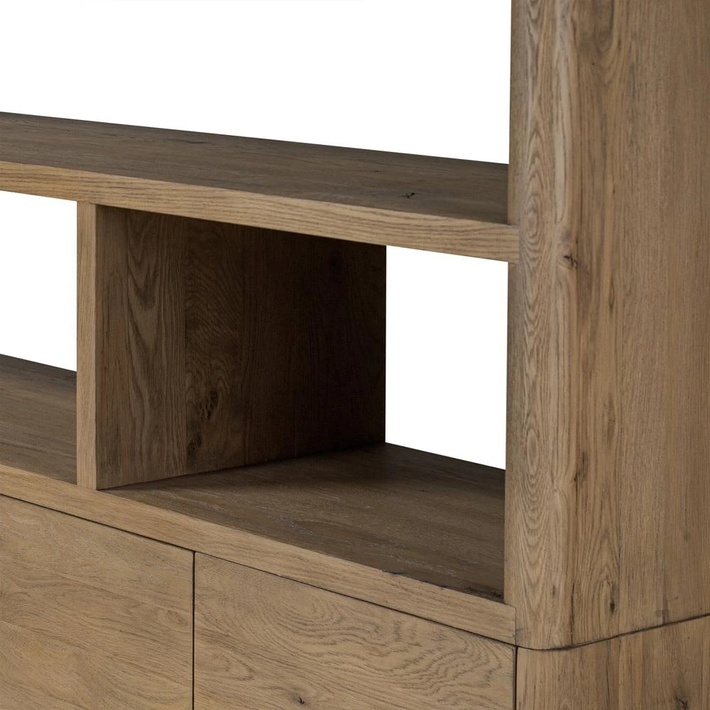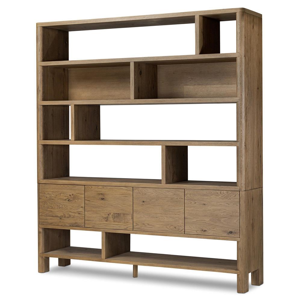 • Dustin French Country Brown Reclaimed Wood 4 Drawer Closed Back Bookcase|Kathy Kuo Home