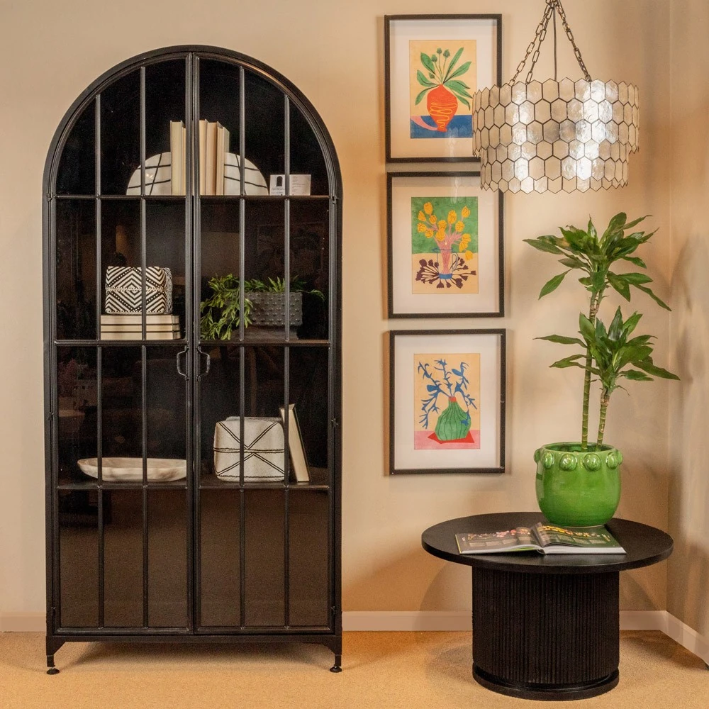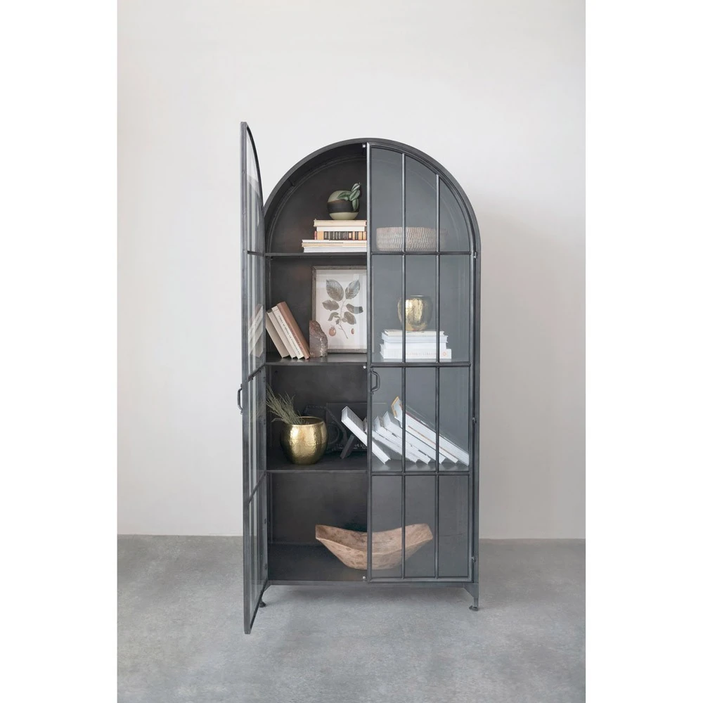 • Features black metal construction with glass arched doors and 3 shelves for storage and display
