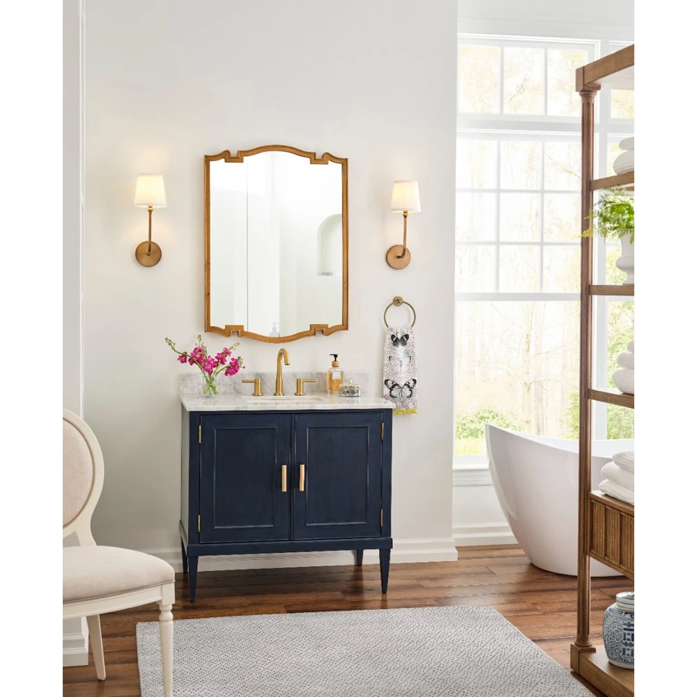 • Finished in navy blue and brushed brass