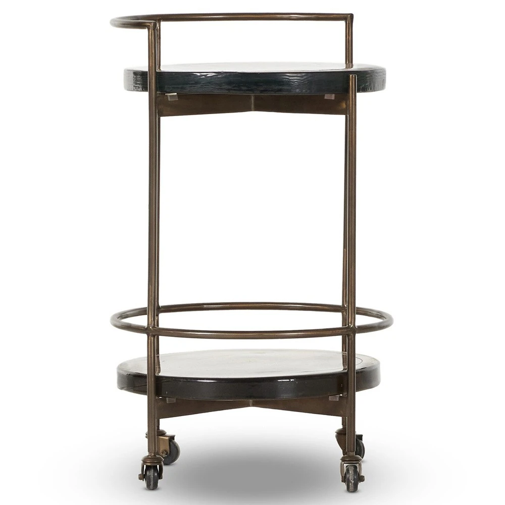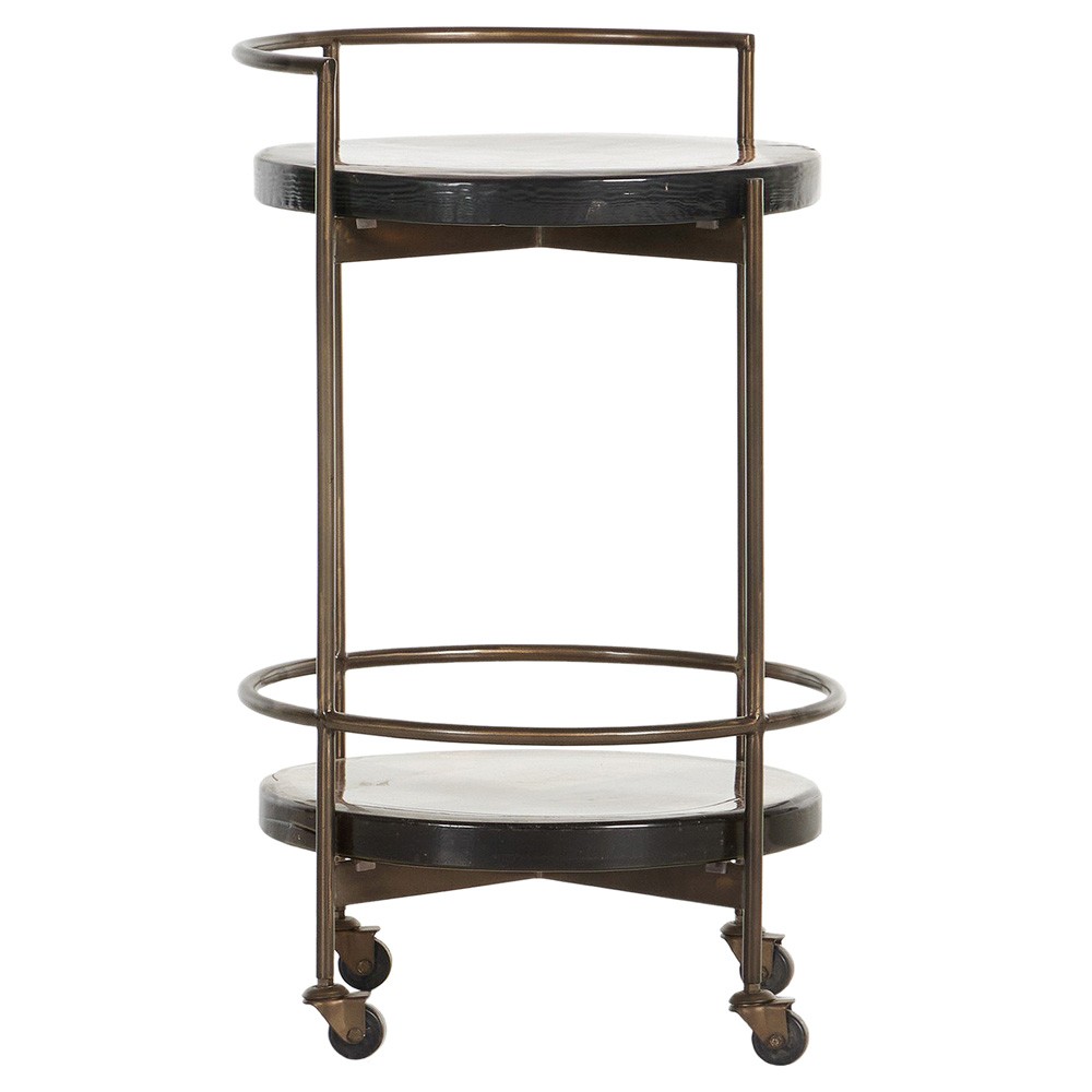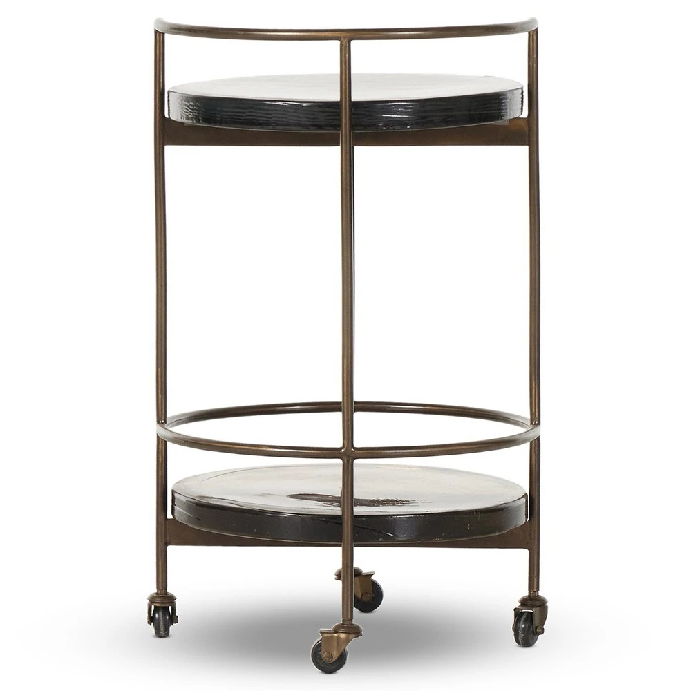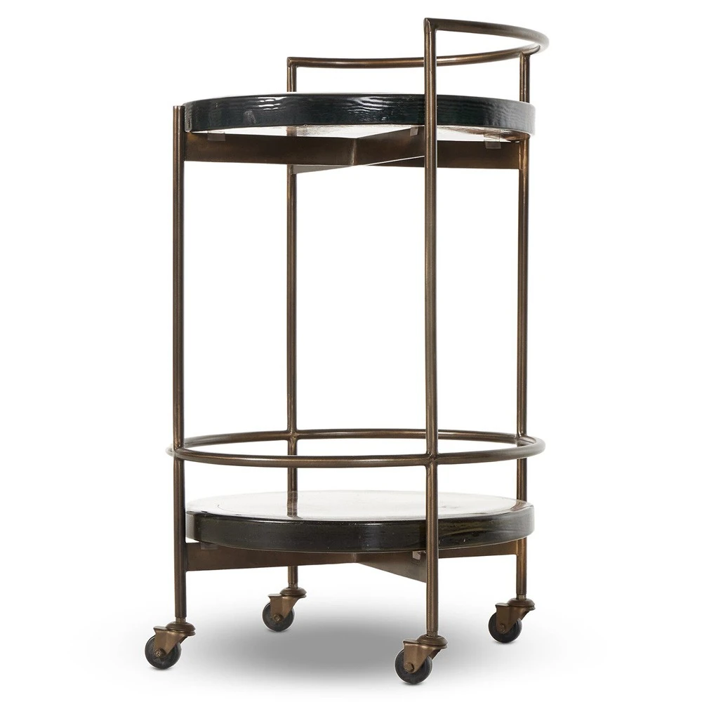 • Features round bar cart with structured dark brass frame and cast glass shelves