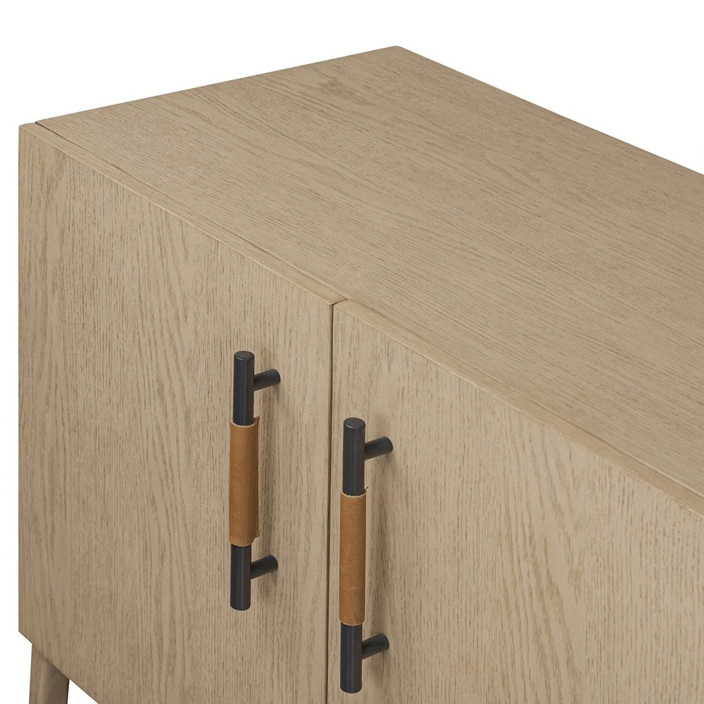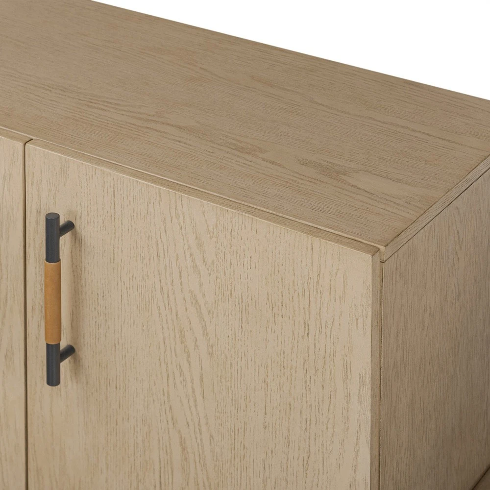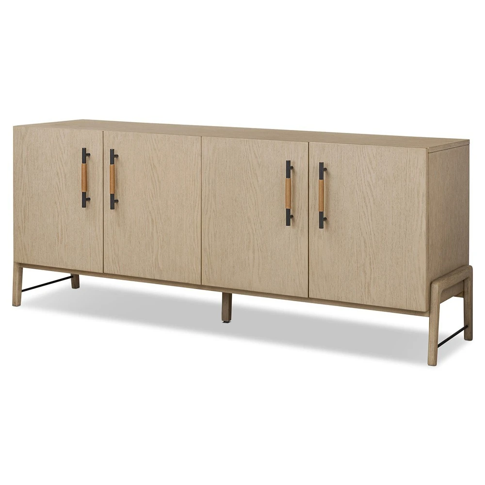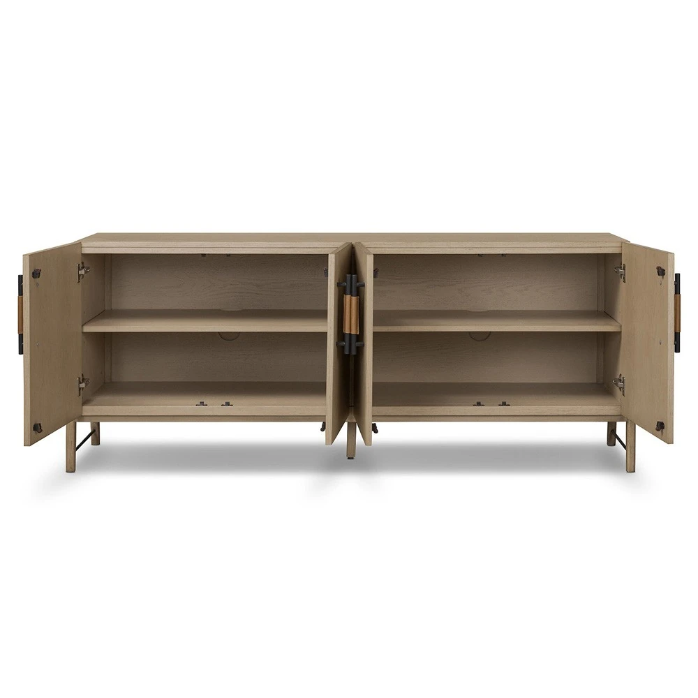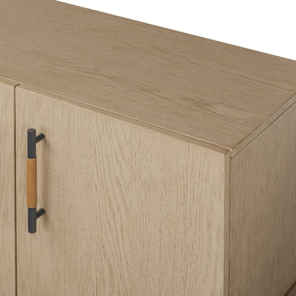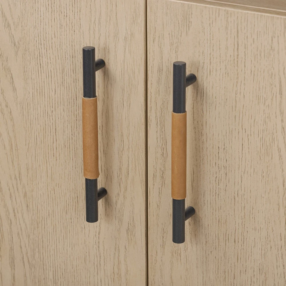 • Features 4 doors with iron hardware wrapped in top-grain leather and outset legs and dual posterior cutouts for seamless cord management