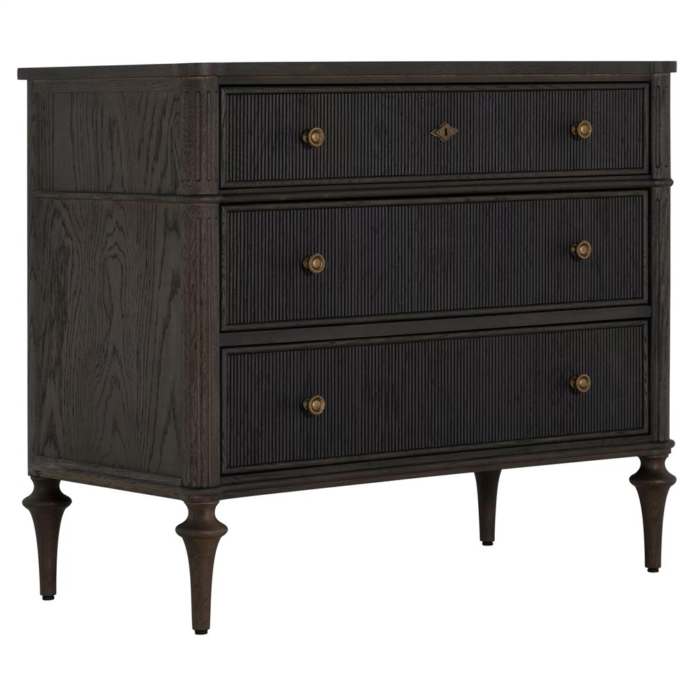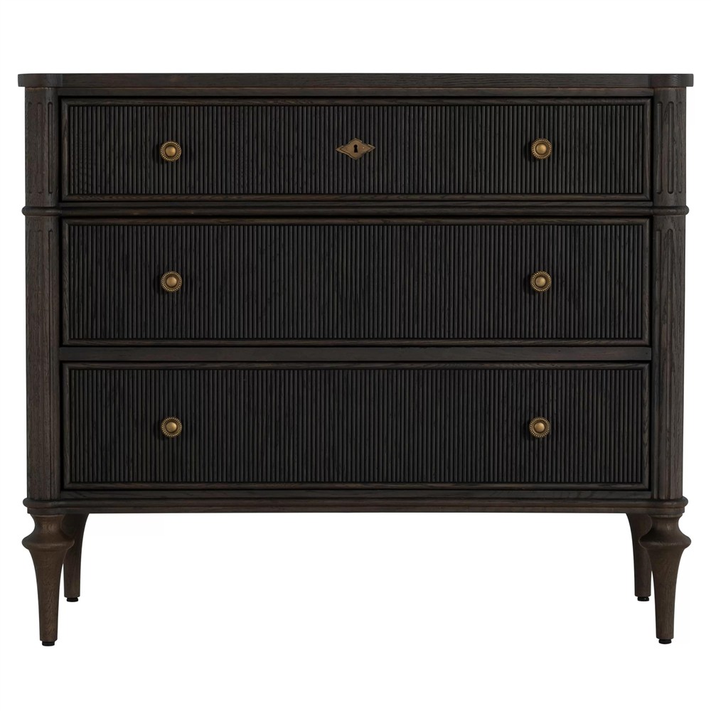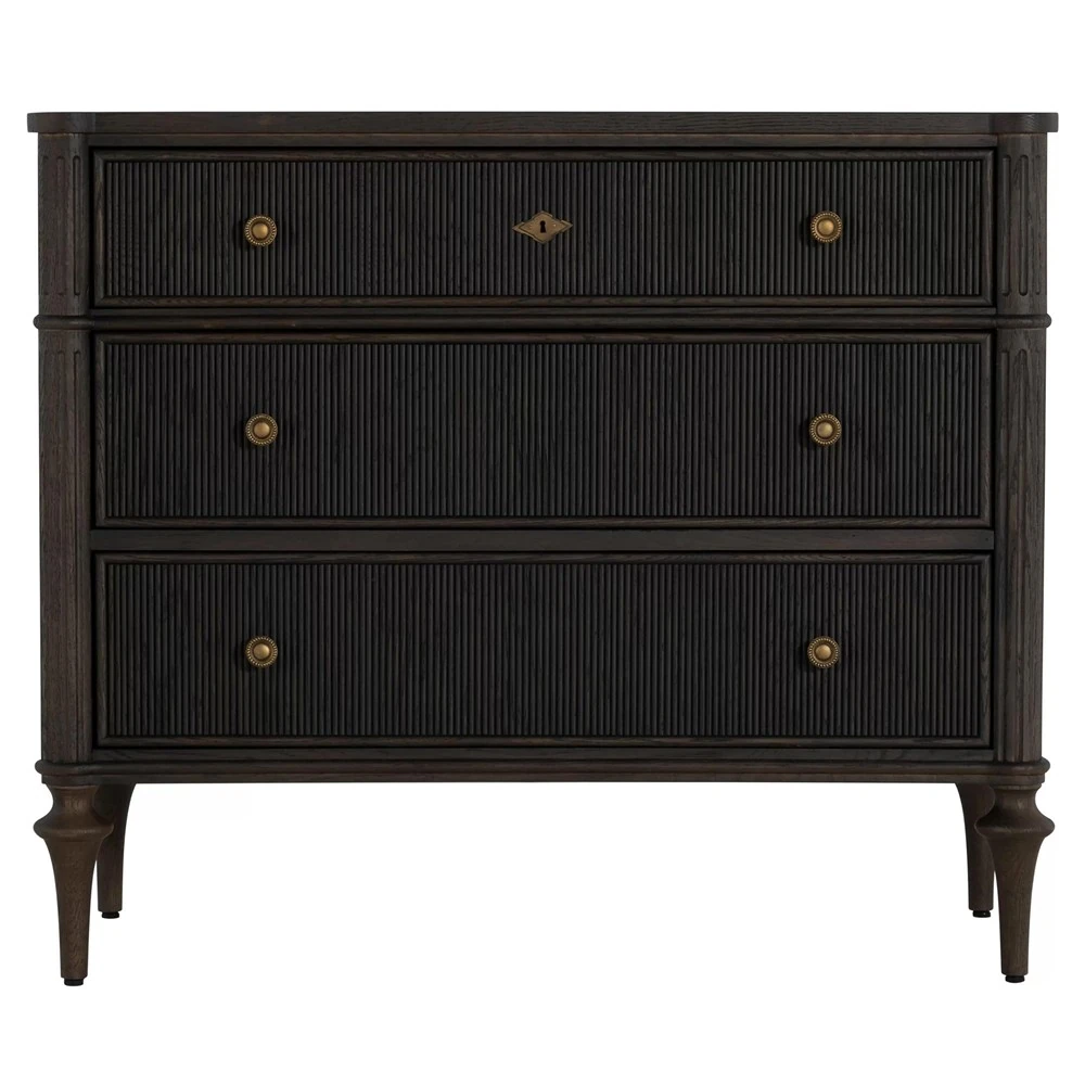 • Features pencil ribbed drawer fronts, a unique antique brass keyhole cover and hardware