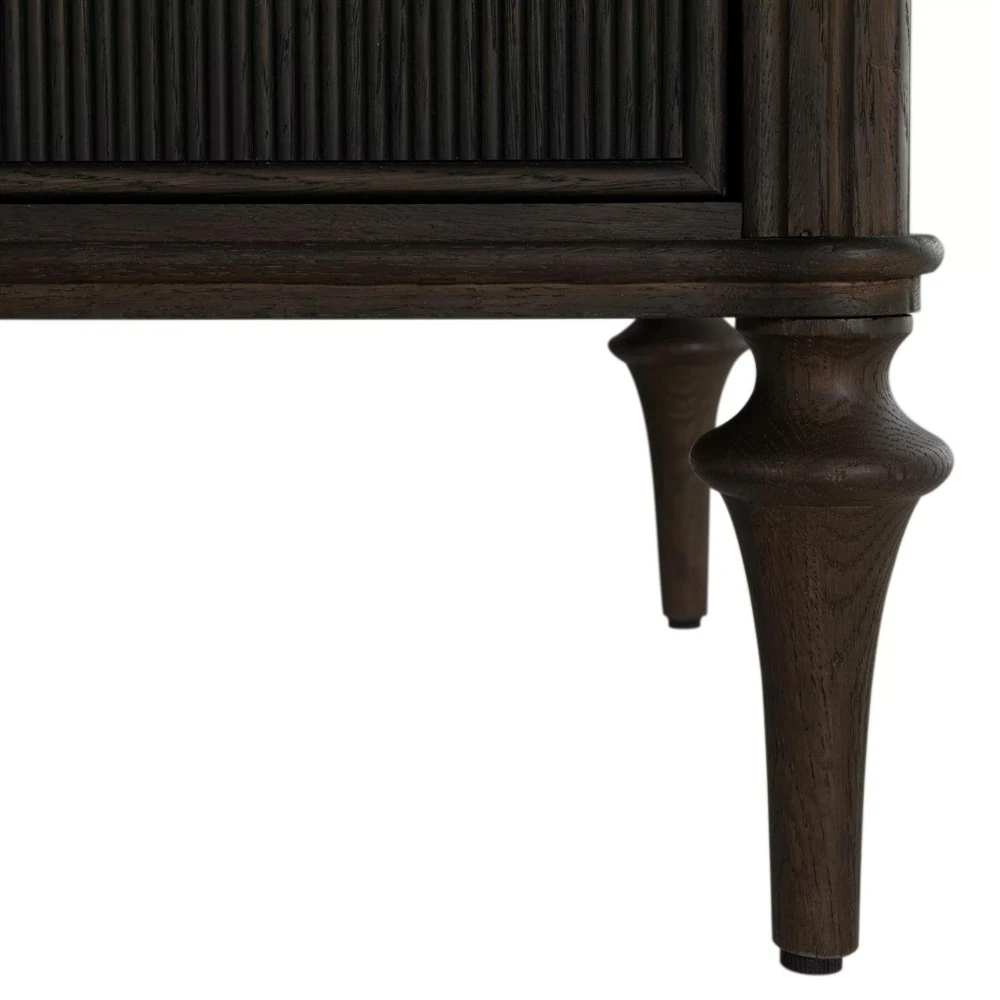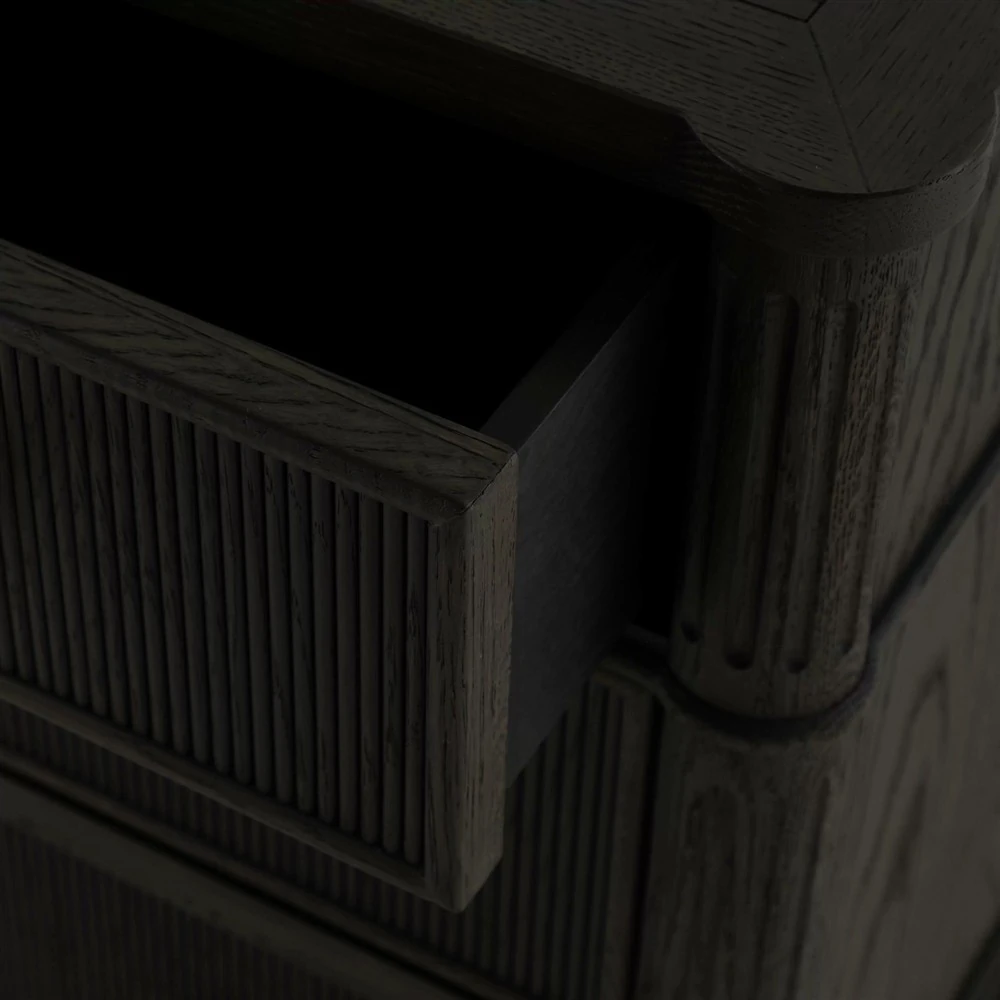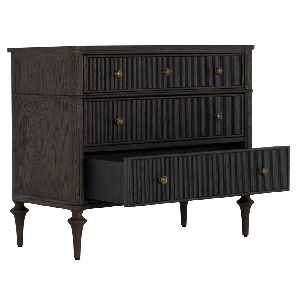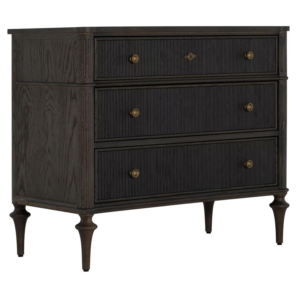 • Features pencil ribbed drawer fronts, a unique antique brass keyhole cover and hardware