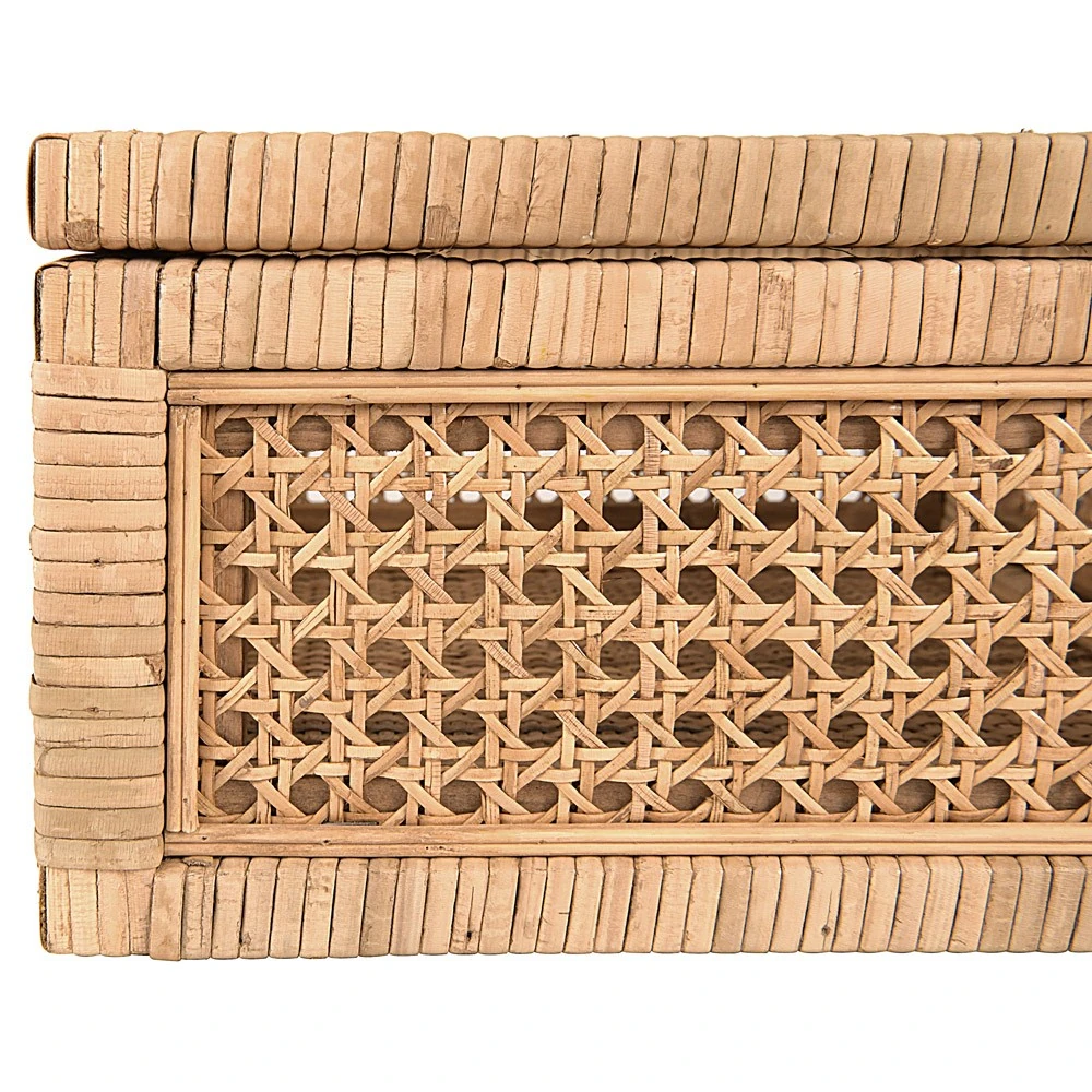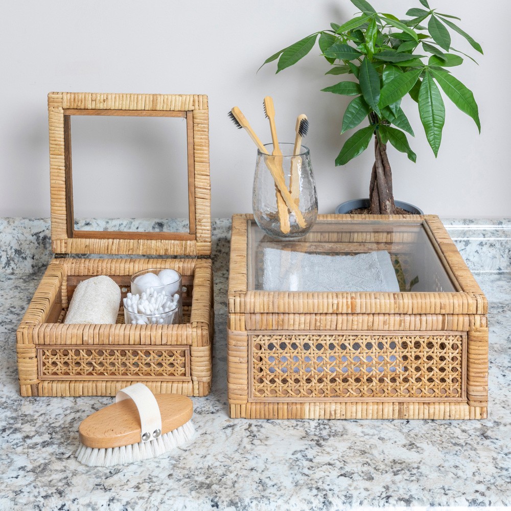 • Designed with a woven rattan and wood frame, this piece features a hinged glass lid for effortless access and clear visibility of stored items