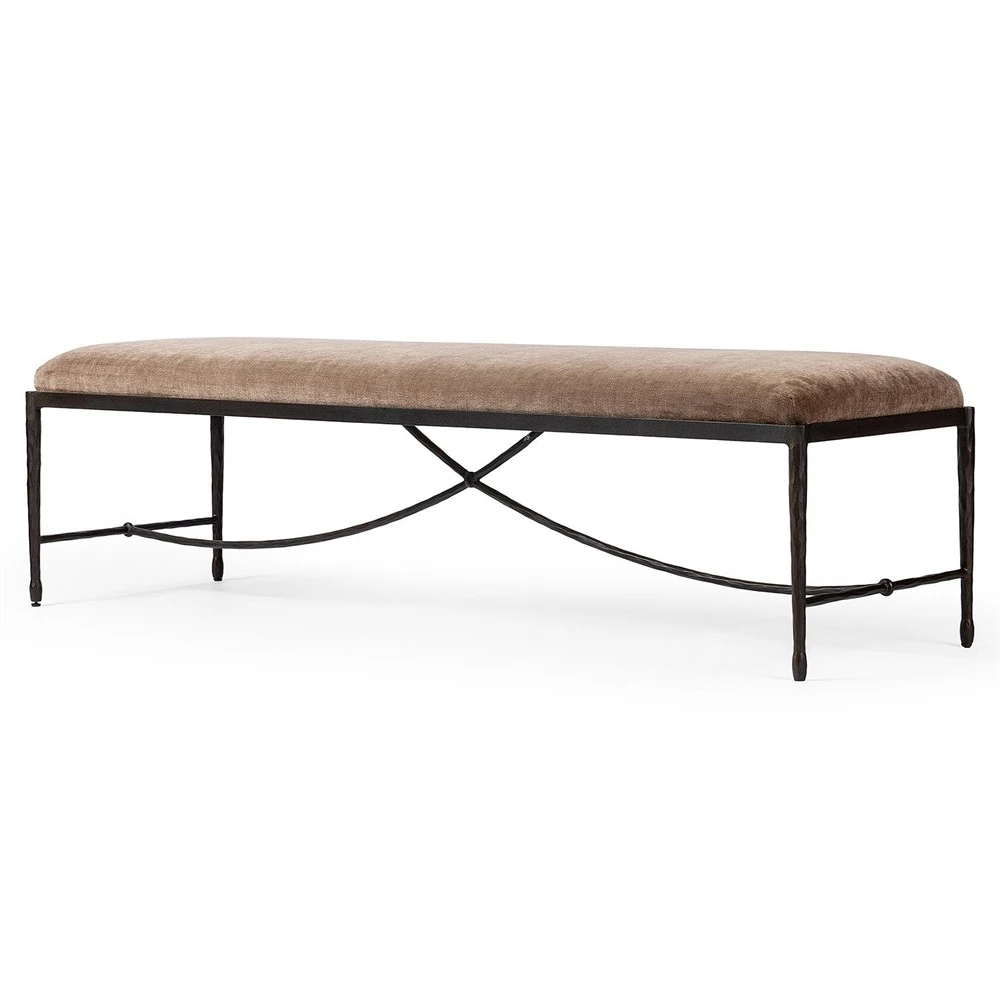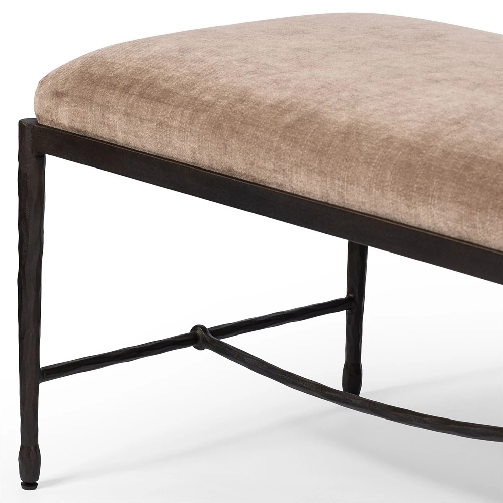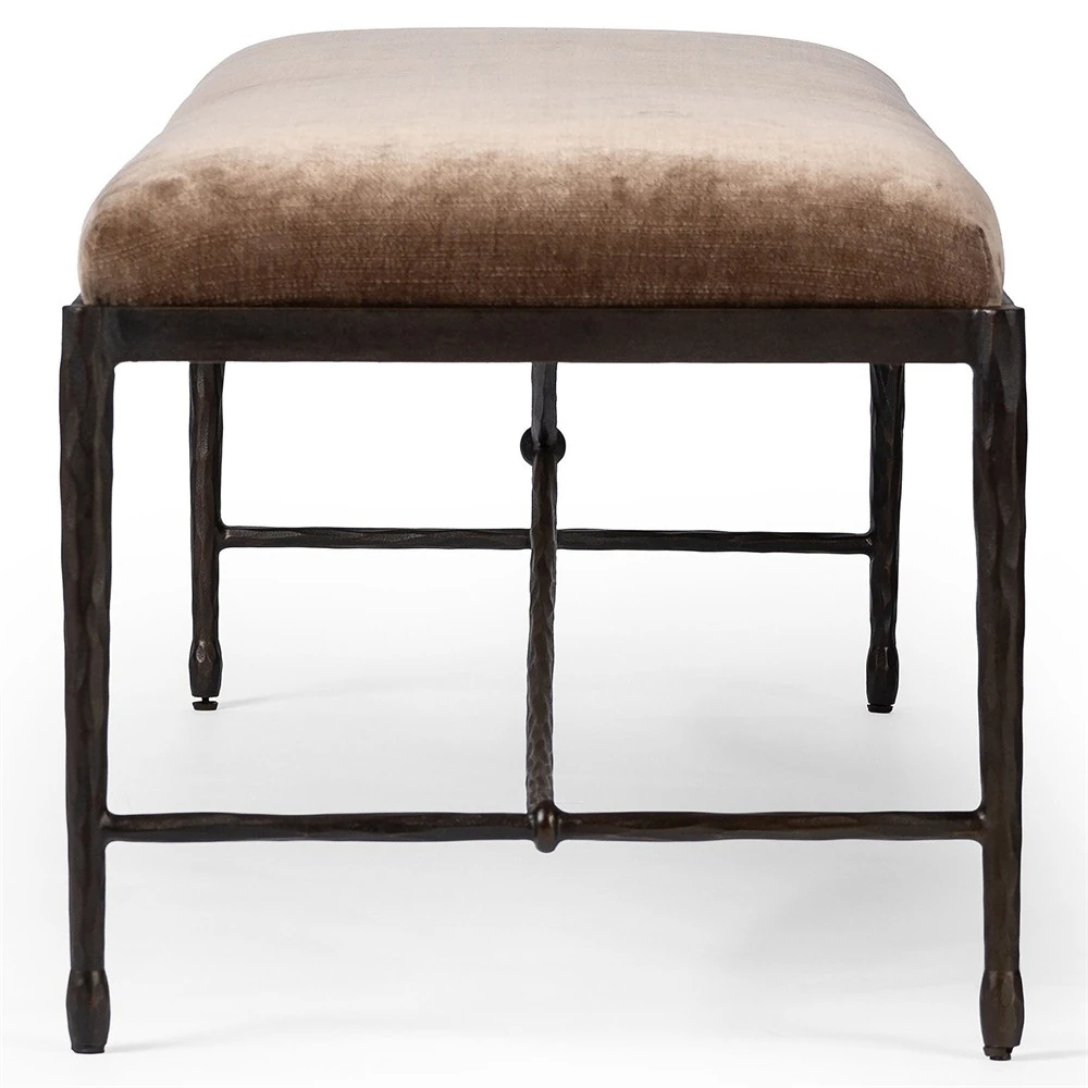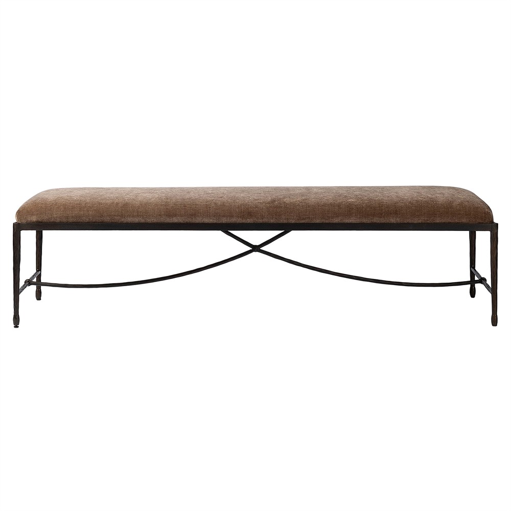 • Features curved stretcher base of bronzed hammered iron and a velvety seat