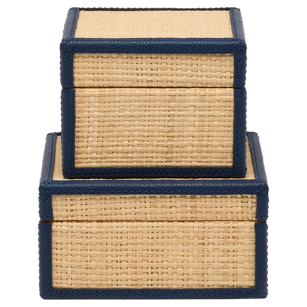 Pigeon and Poodle Hanford Coastal Natural Raffia Navy Blue Leather Trim Decorative Box - Set of 2